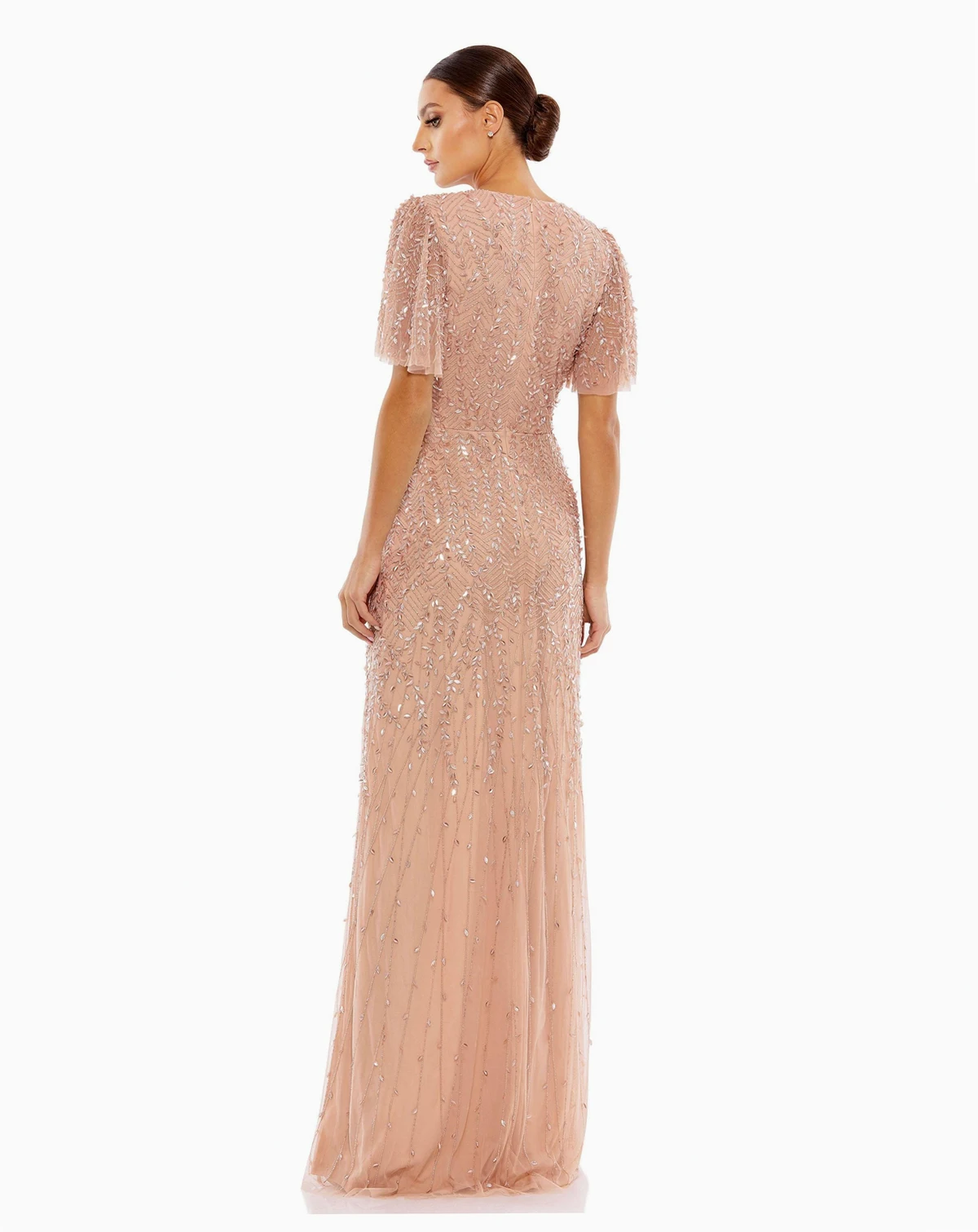 Embellished gown featuring a flattering V-neckline, soft flutter sleeves, and a flowing floor-length silhouette. Detailed with intricate beadwork and graceful movement, this elegant style is perfect for weddings, evening events, and special occasions.