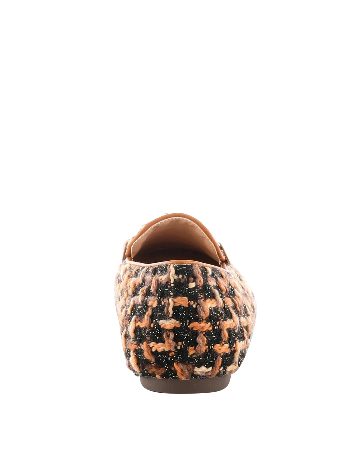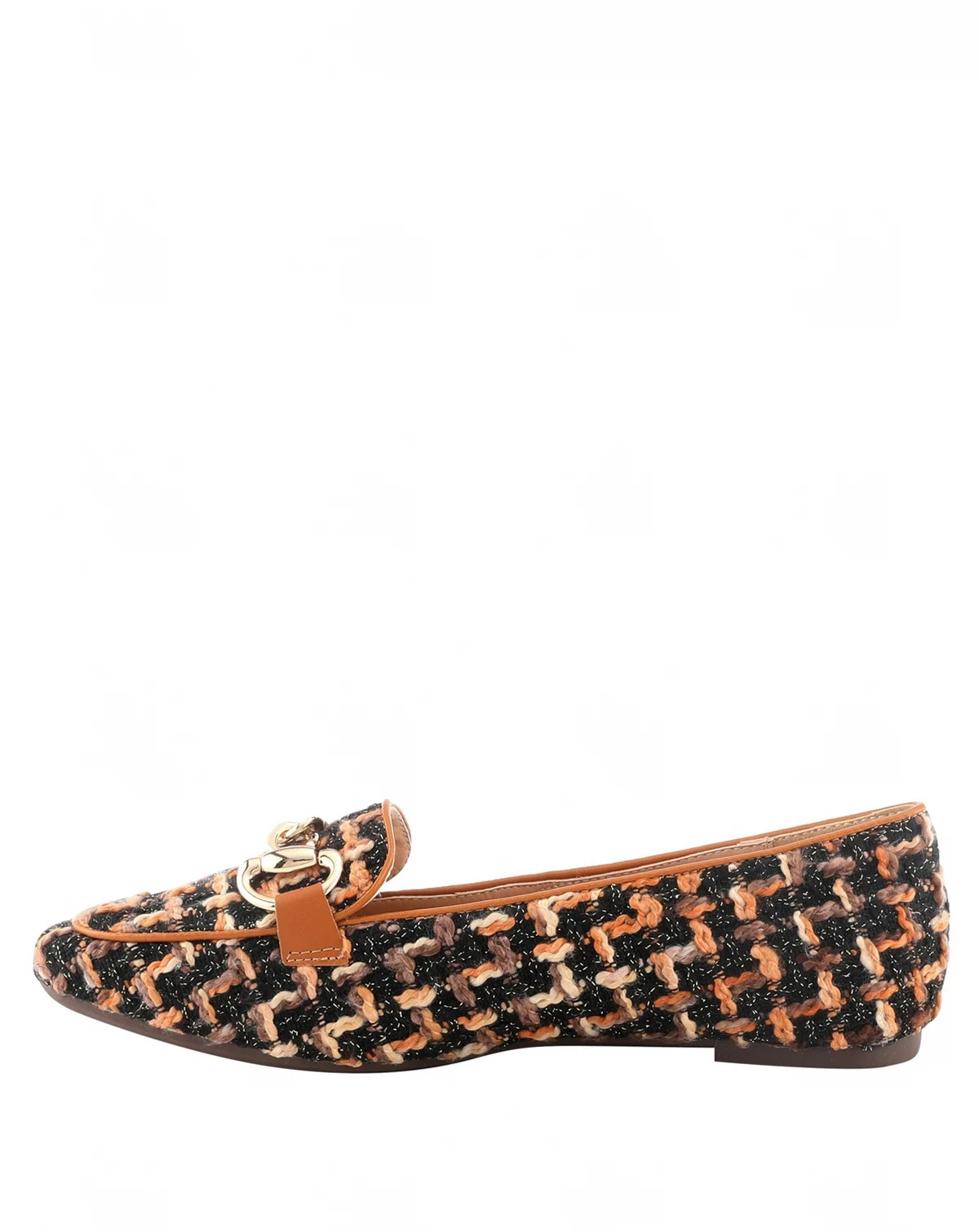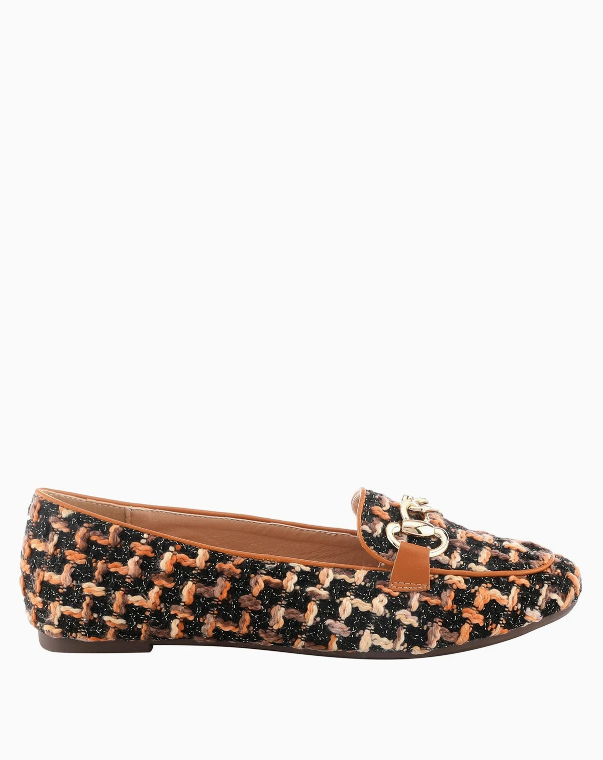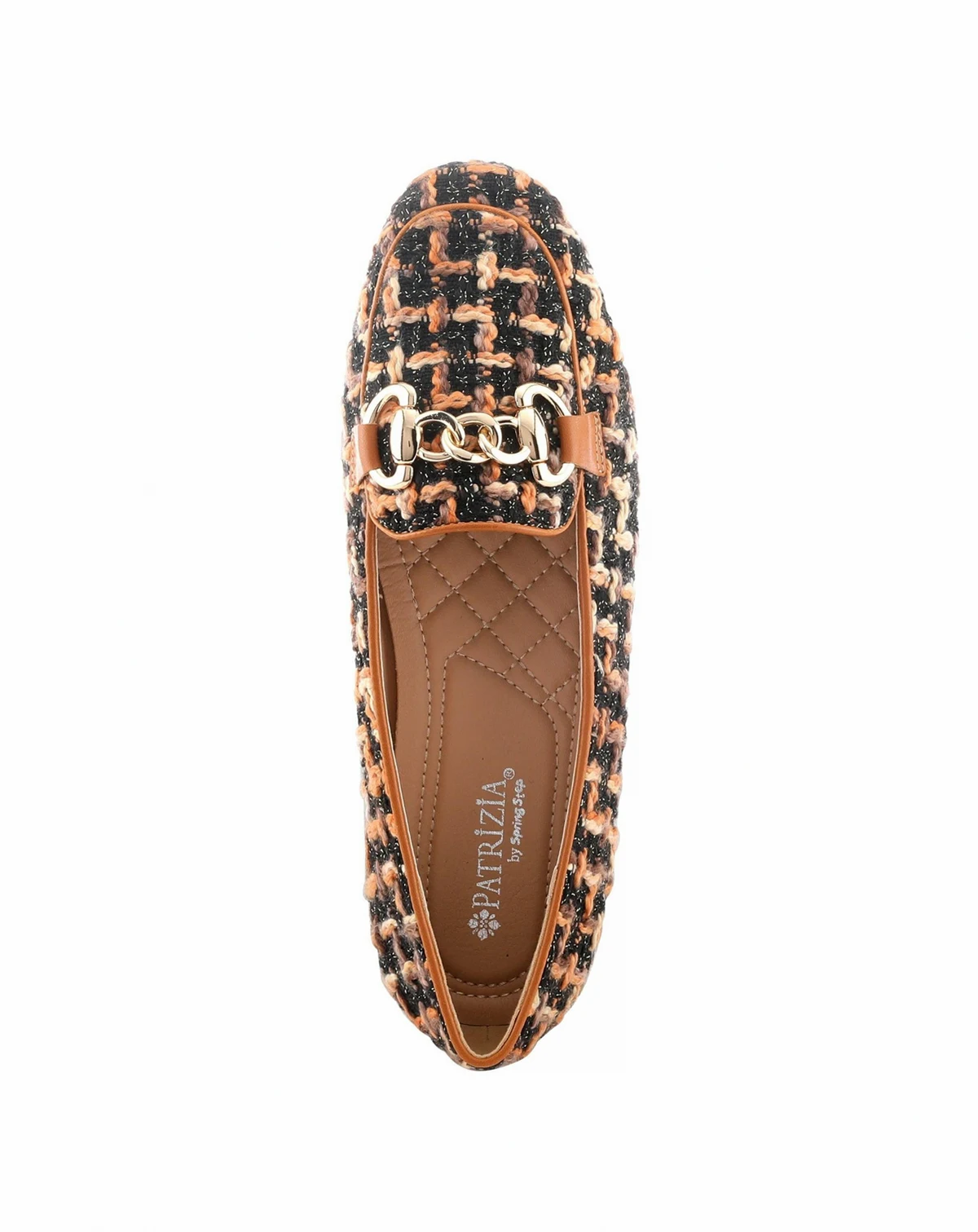 Step into effortless sophistication with the Patrizia KNITKNOT loafers. Designed with a colorful boucle upper for rich texture and topped with polished gold-tone chain hardware, this slip-on flat makes a chic statement. Tonal piping around the vamp adds refined structure, while a padded insole and flexible outsole ensure comfort for all-day wear. A fashion-forward essential that blends elegance with ease.