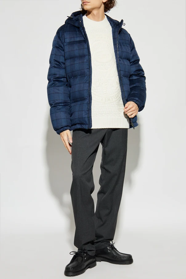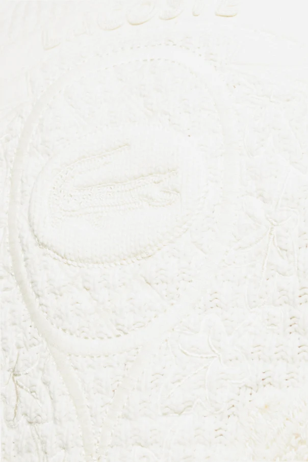 At the heart of this piece lies an exquisite focal point: a large, three-dimensional designer logo, rendered in intricate relief embroidery. Surrounded by heraldic motifs and signature lettering at the base, this luxurious detail signals heritage and exclusivity. Decorative accents, including probable references to the designer's legacy, complete the composition, making this sweater a statement of distinctive taste.