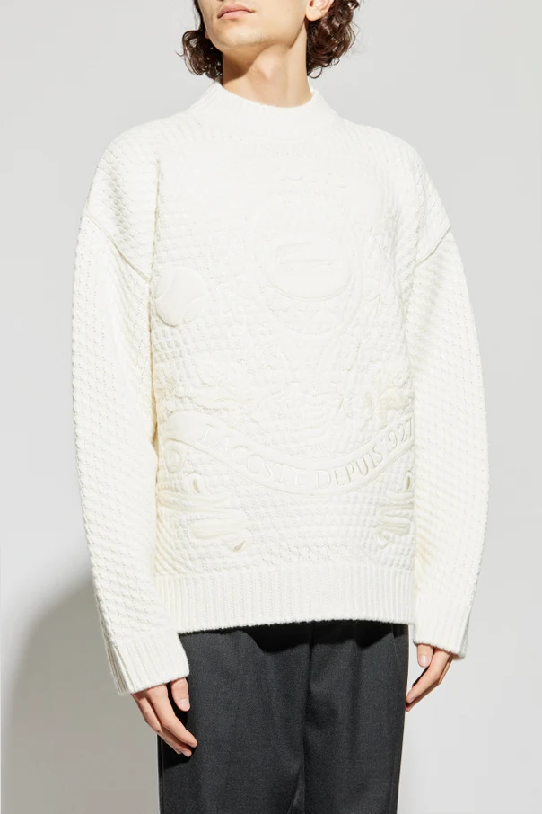Elevate your wardrobe with this distinguished cream turtleneck sweater from LACOSTE RUNWAY . Impeccably crafted from premium, thick wool, its visible textured knit imparts natural warmth and depth, embodying refined sophistication. The sweater presents a classic, regular silhouette with gently dropped shoulders and straight sleeves, offering both comfort and a modern, relaxed allure.