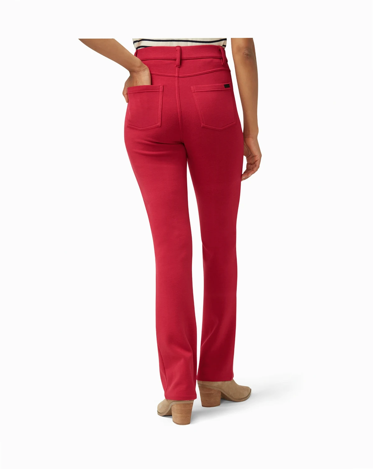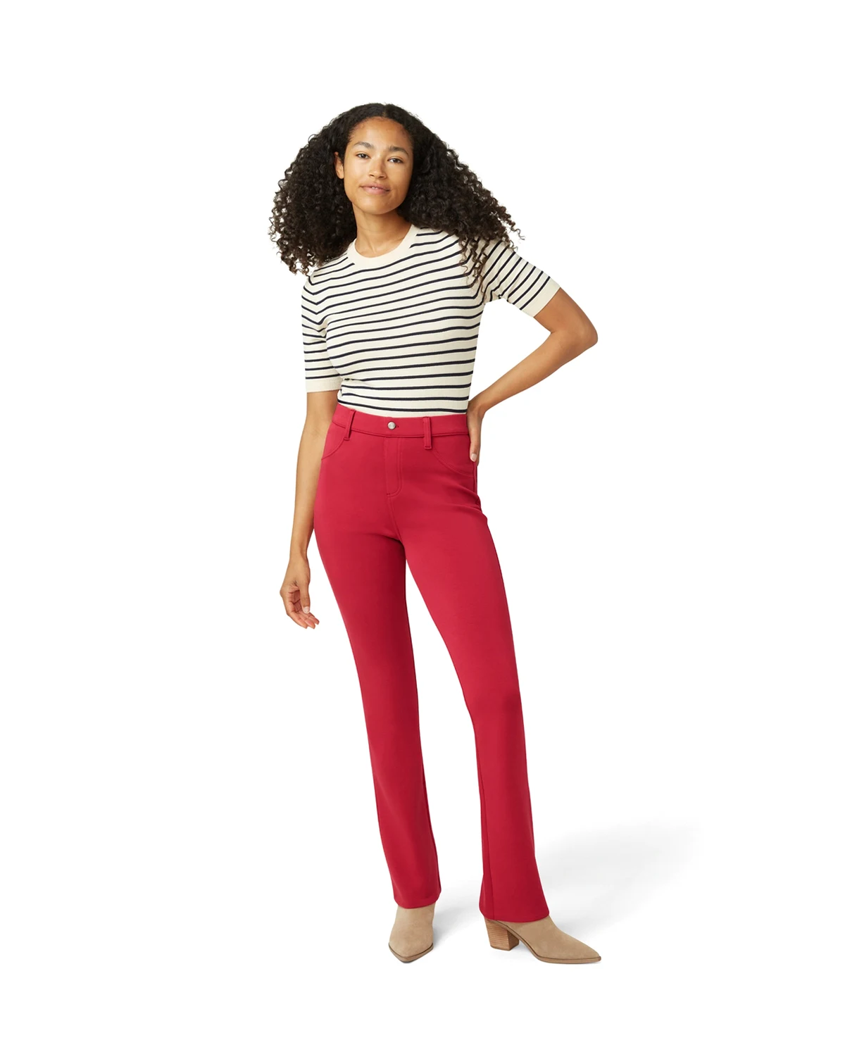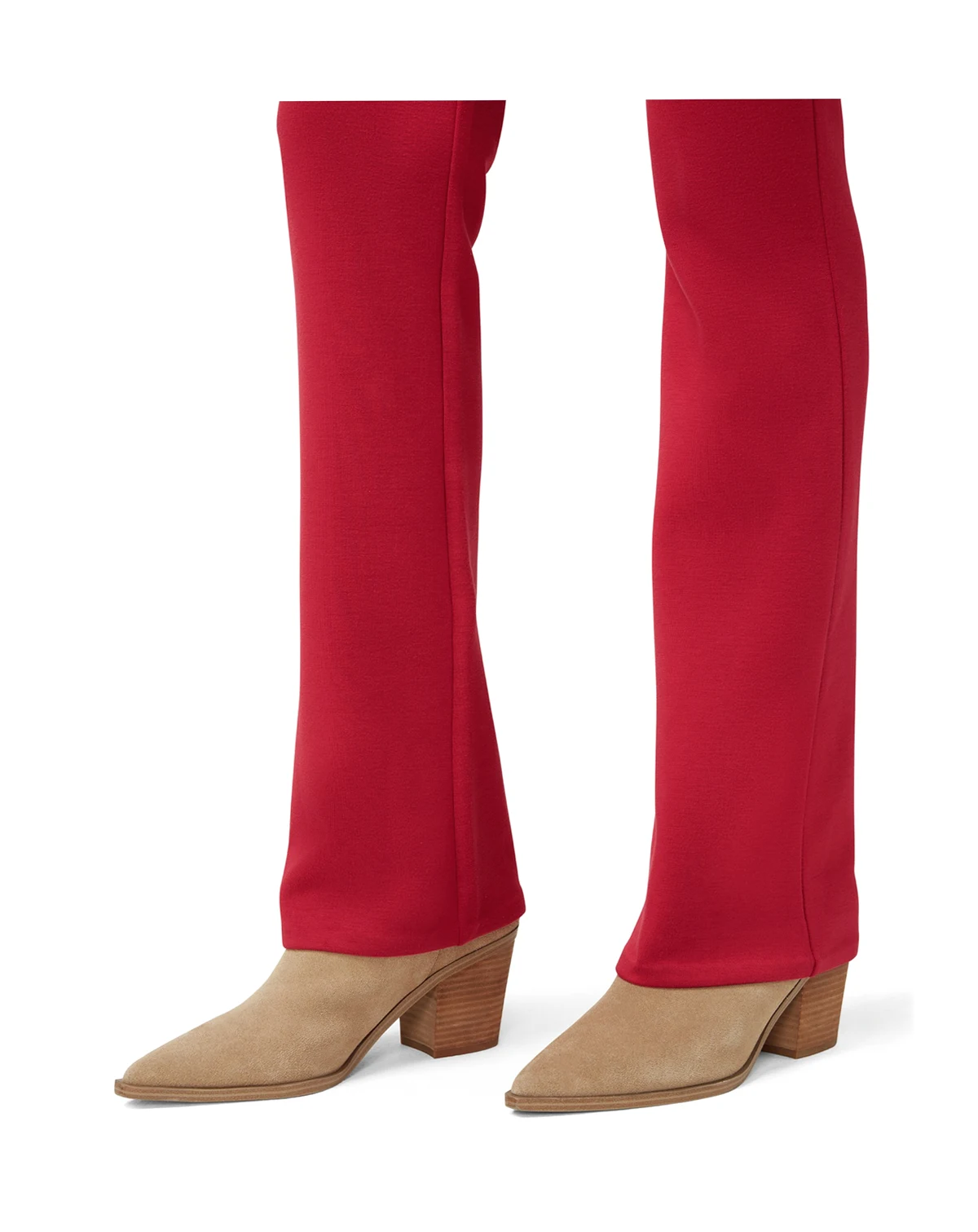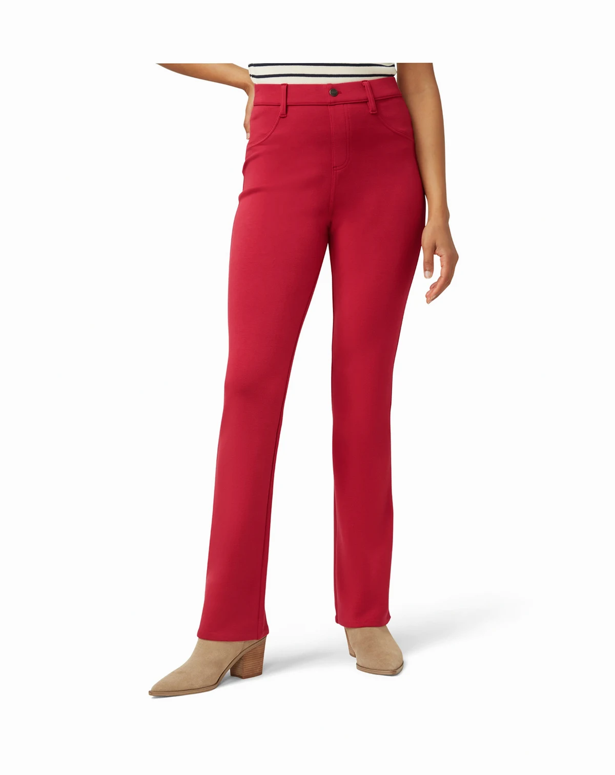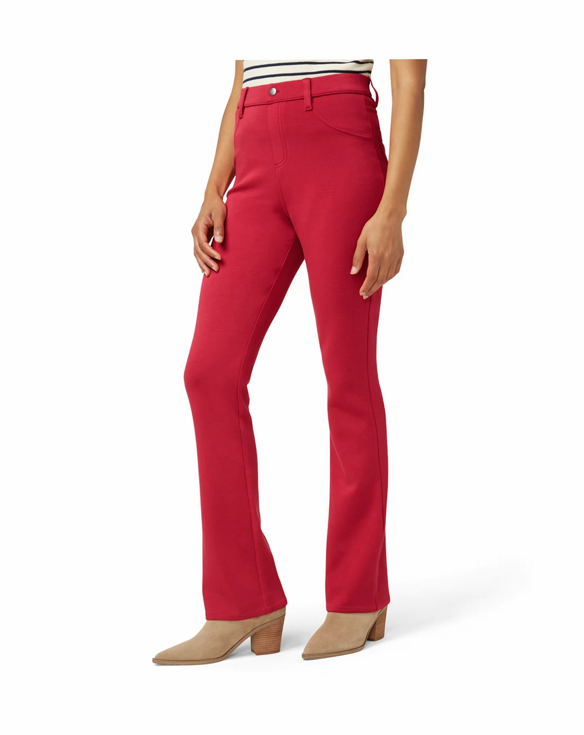 Meet your new off-duty essential with these Hue pants in ultra-soft jersey knit. The high-rise baby bootcut silhouette blends lounge-worthy comfort with a flattering, elevated look. Designed with a mock fly, front pockets, a separate elastic waistband, and belt loops, this pull-on style delivers effortless polish for everyday wear.
