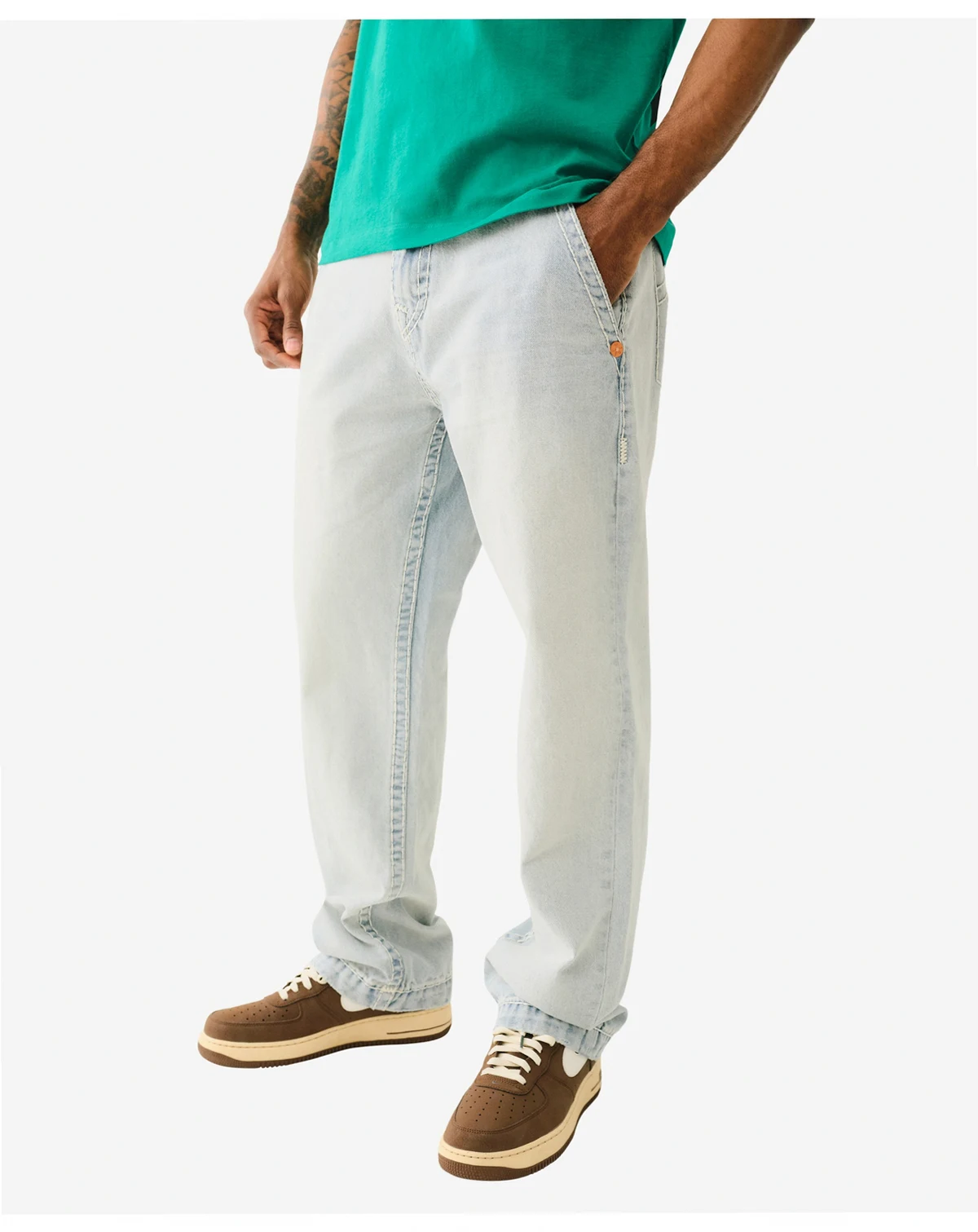 Go from day to night in the Bobby Workwear Super T Baggy Jean. Crafted in a super light wash, this pair of blue collar inspired jeans feature a zip fly, belt loops, and brass hardware. Complete with Super T stitching, 32" inseam, and horseshoe detailing on the back welt pockets.
