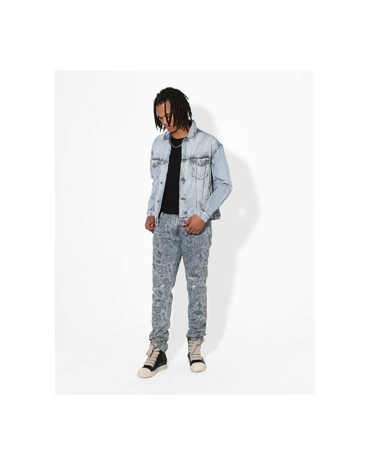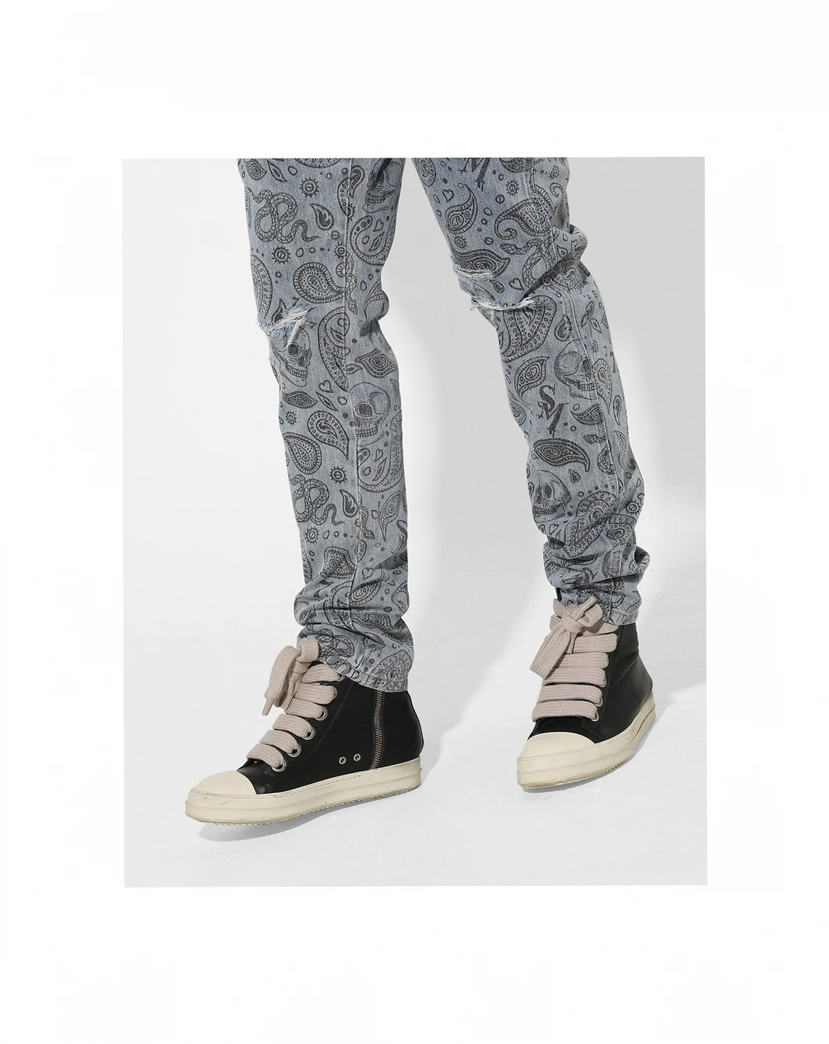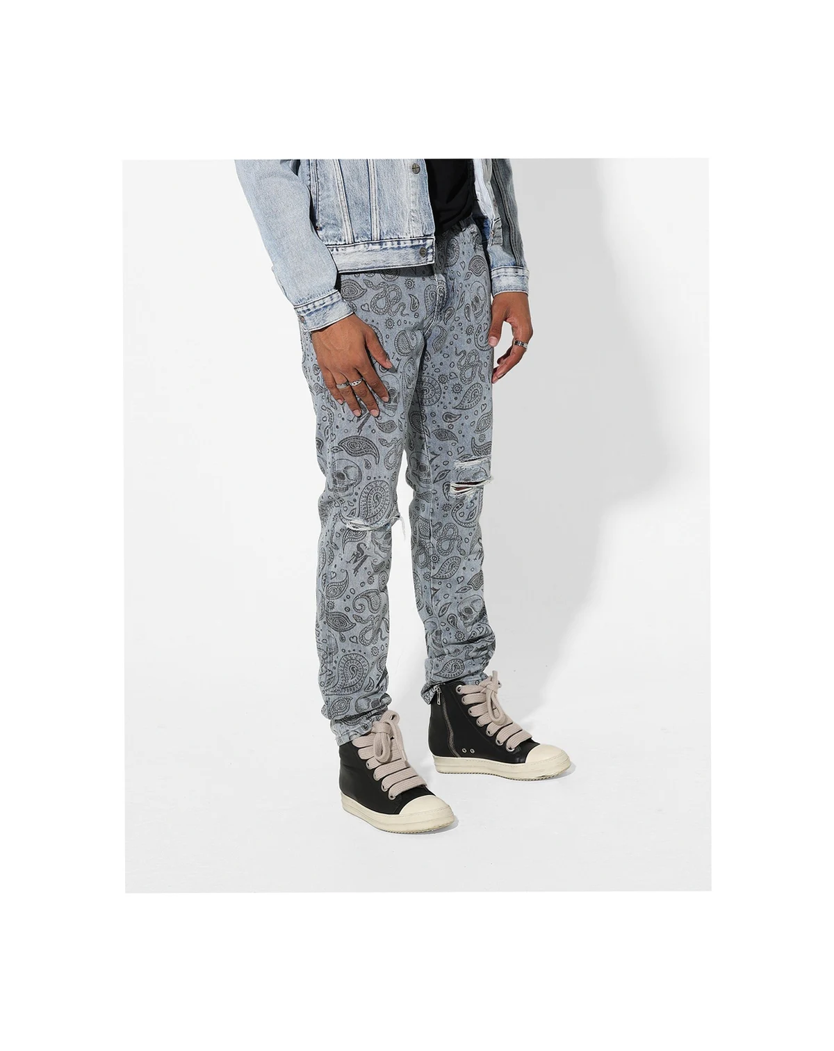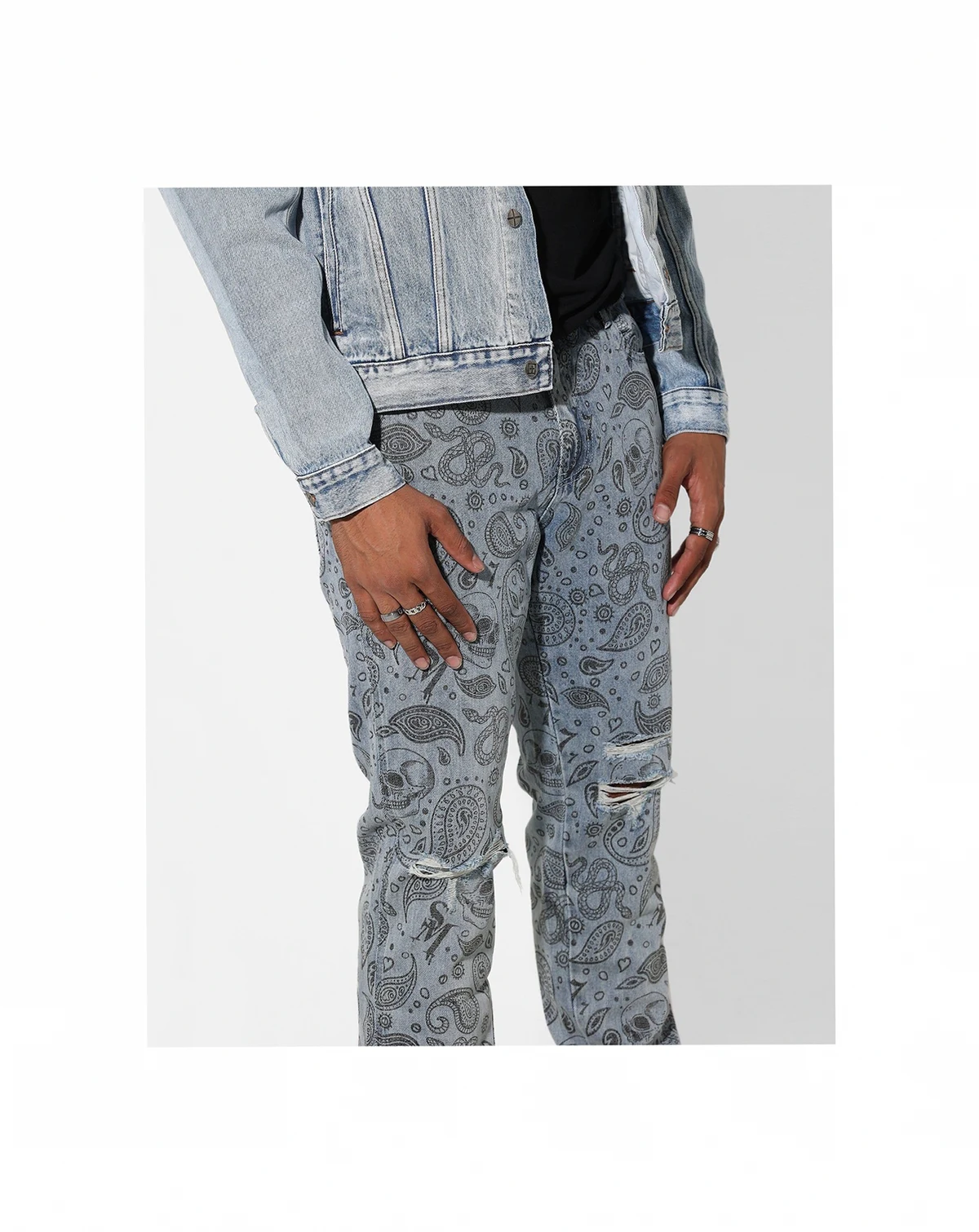 These unique jeans are going to elevate your street style. The all over skull and paisley print paired with distressing give them an added flair and the signature Saint embroidery tops them off.