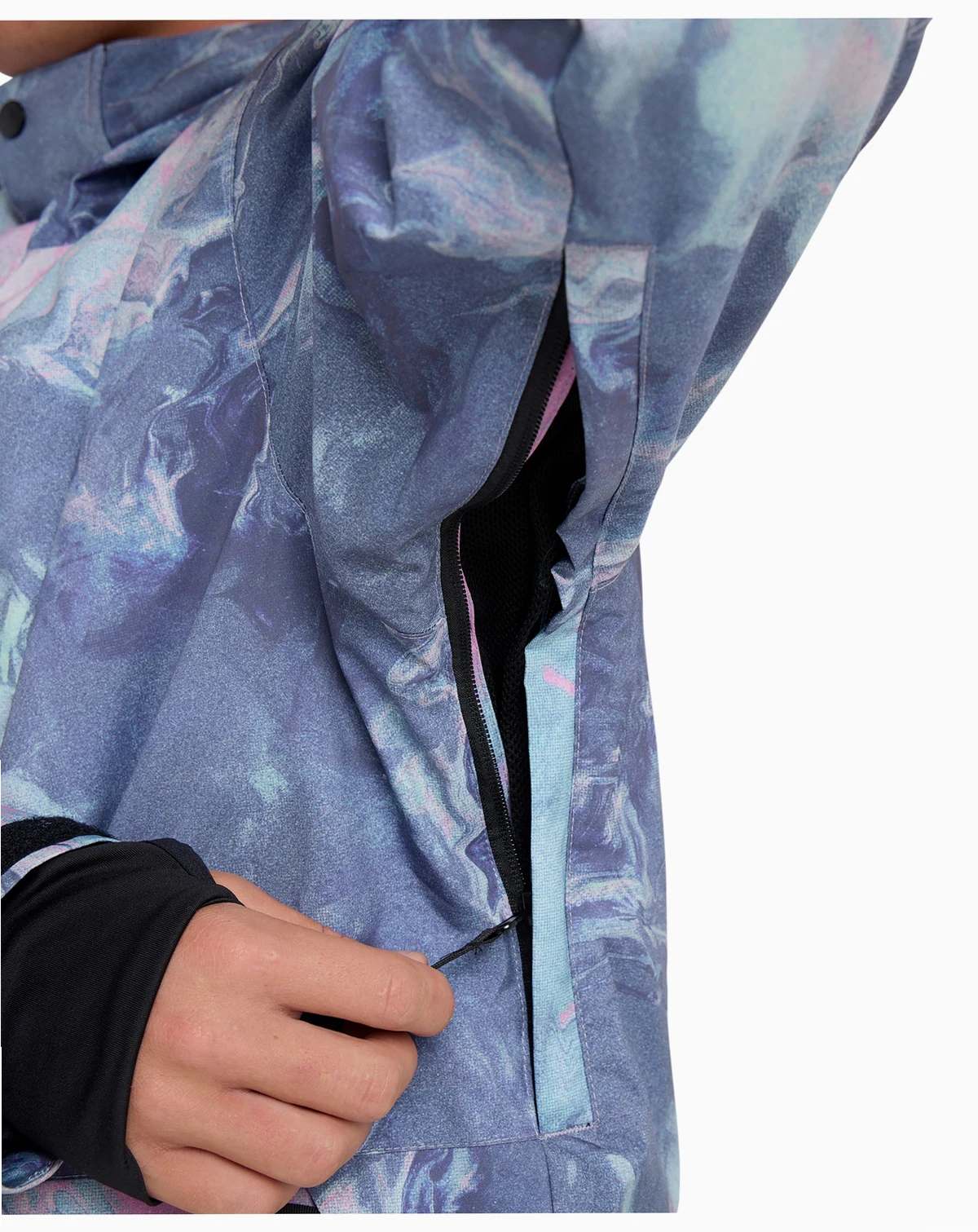 Conquering the slopes with solid waterproofing, this Quiksilver jacket includes smart features like underarm vents for temperature control. Multiple pockets, including a pass pocket on the sleeve, keep your essentials handy.