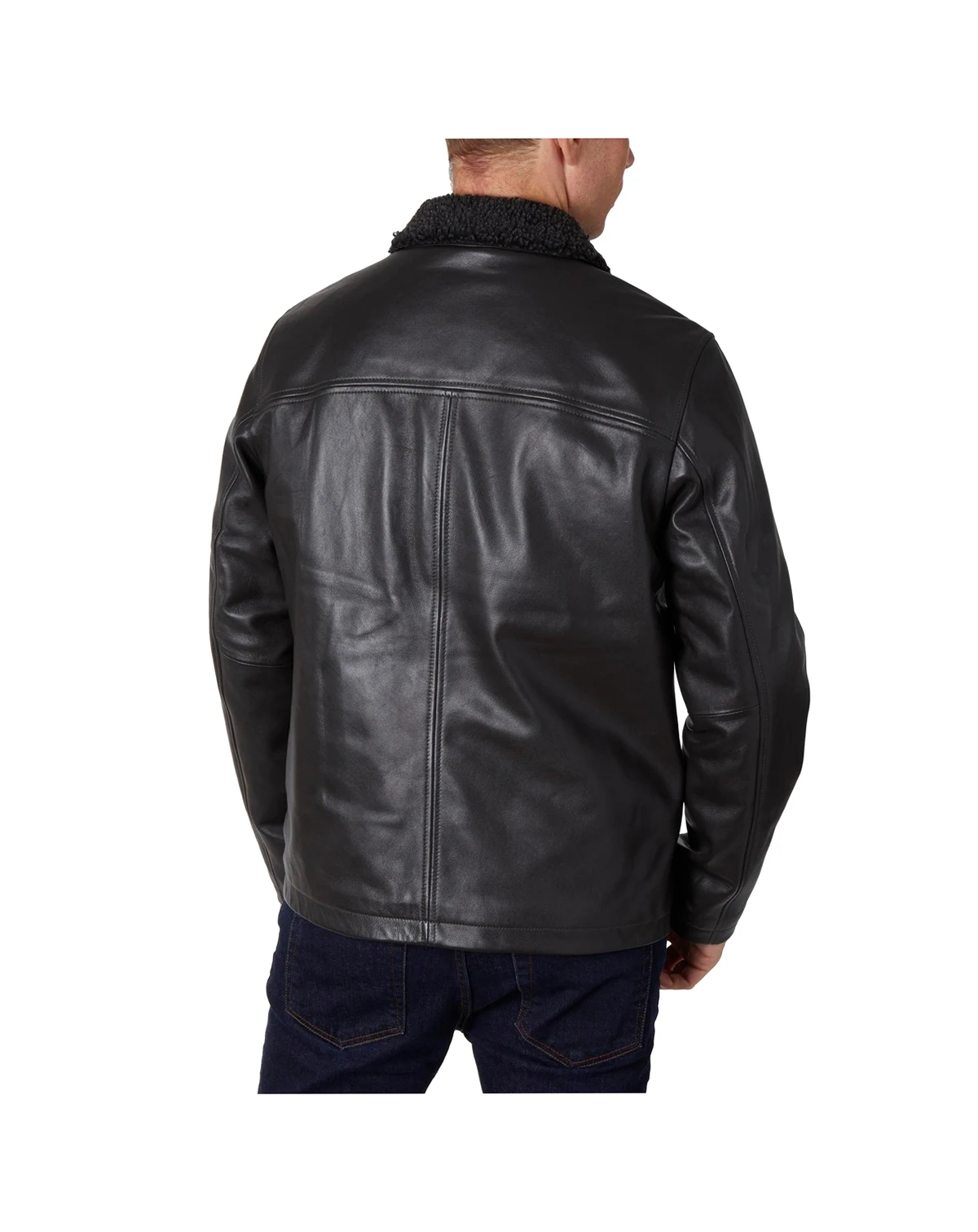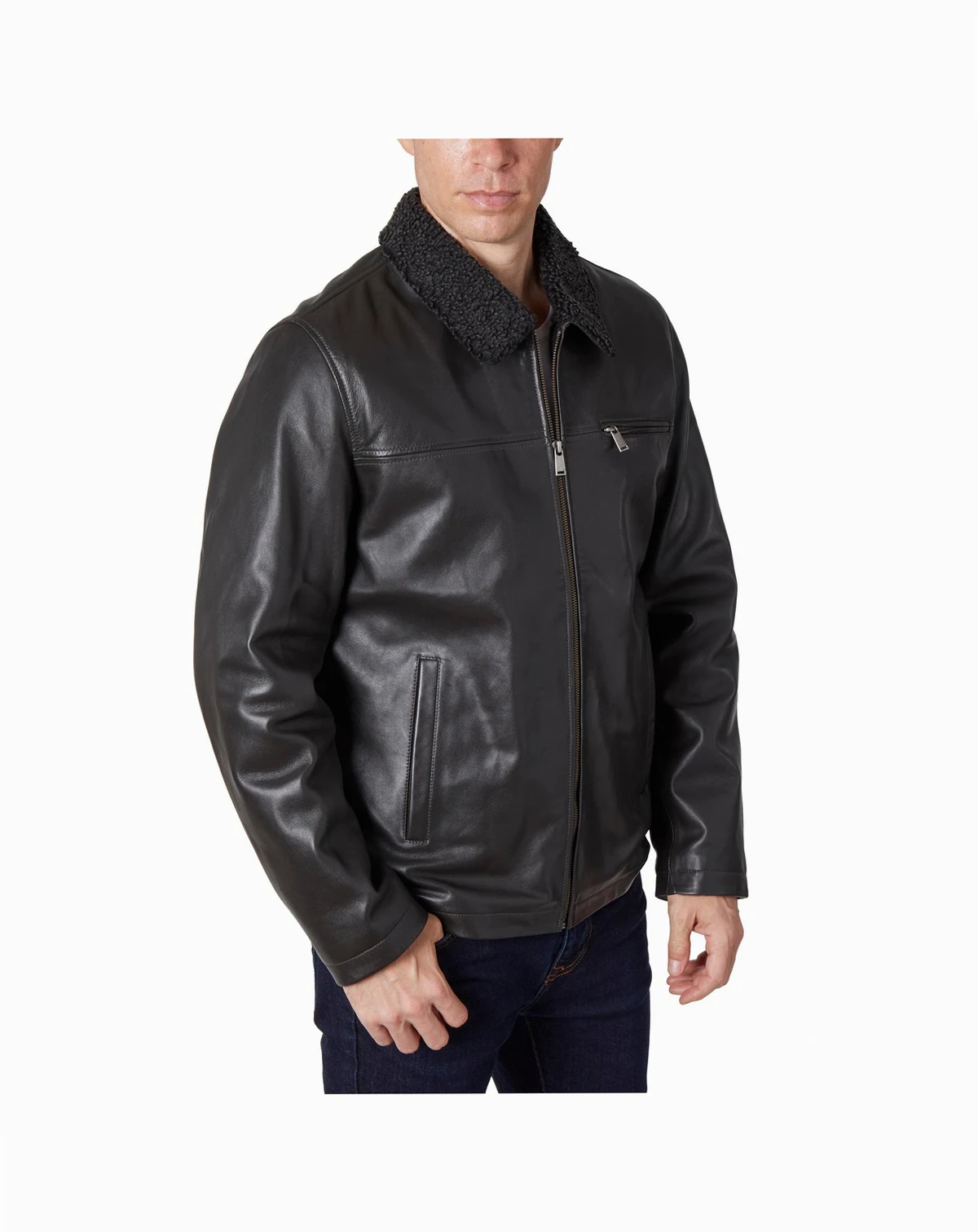 Perry Ellis portfolio genuine leather jacket with chest pocket and zipper closure. Jacket has sherpa collar and inside sherpa placket trim.