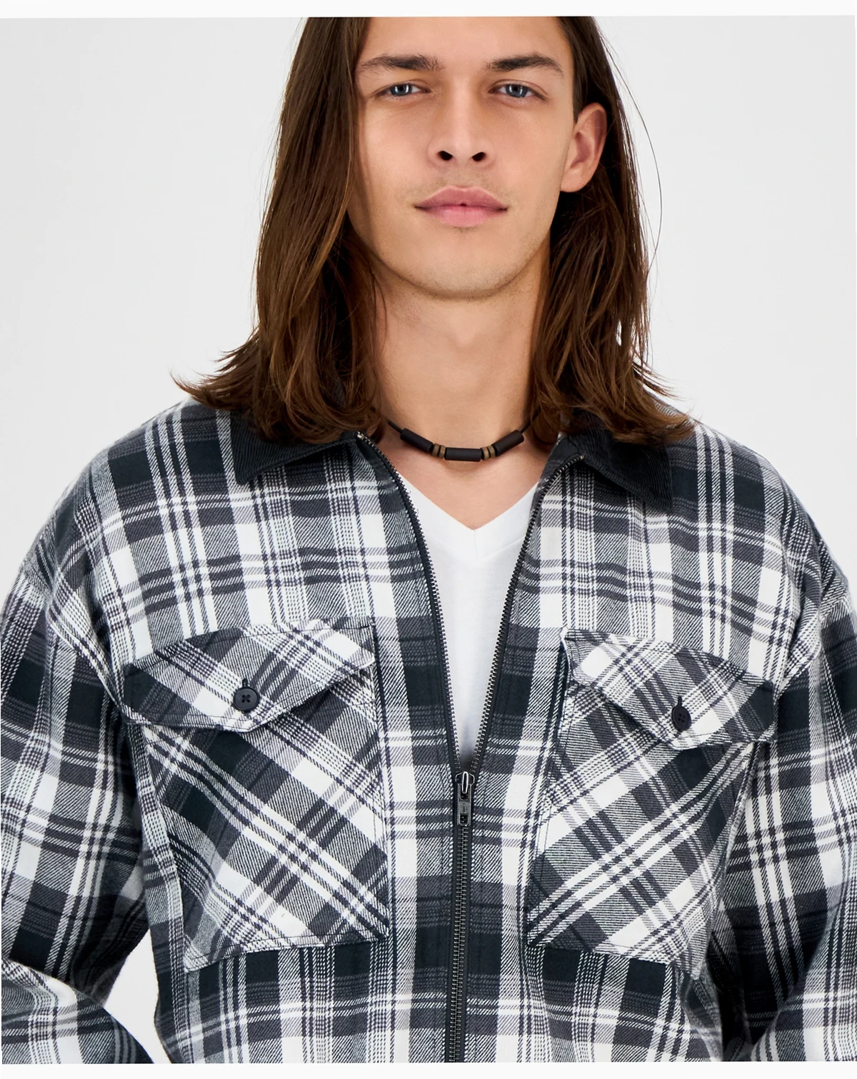 Keep your look cozy with this overshirt from Sun + Stone. Styled in a classic plaid, this cotton shirt is perfect for layering.