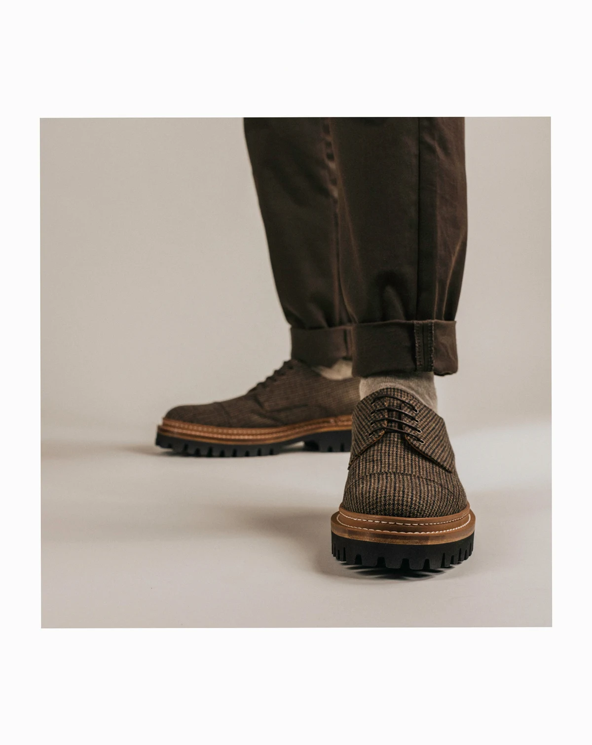 Introducing the Country Captoe in taupe. This shoe is a testament to TAFT's commitment to craftsmanship. It has a striking Portuguese wool upper, offering a unique look and feel. The rubber commando sole, accentuated by a custom sidewall welt and cushioned insole, promise durability and comfort with every step. Its blake construction ensure that this shoe is not just a fleeting trend but a lasting favorite.