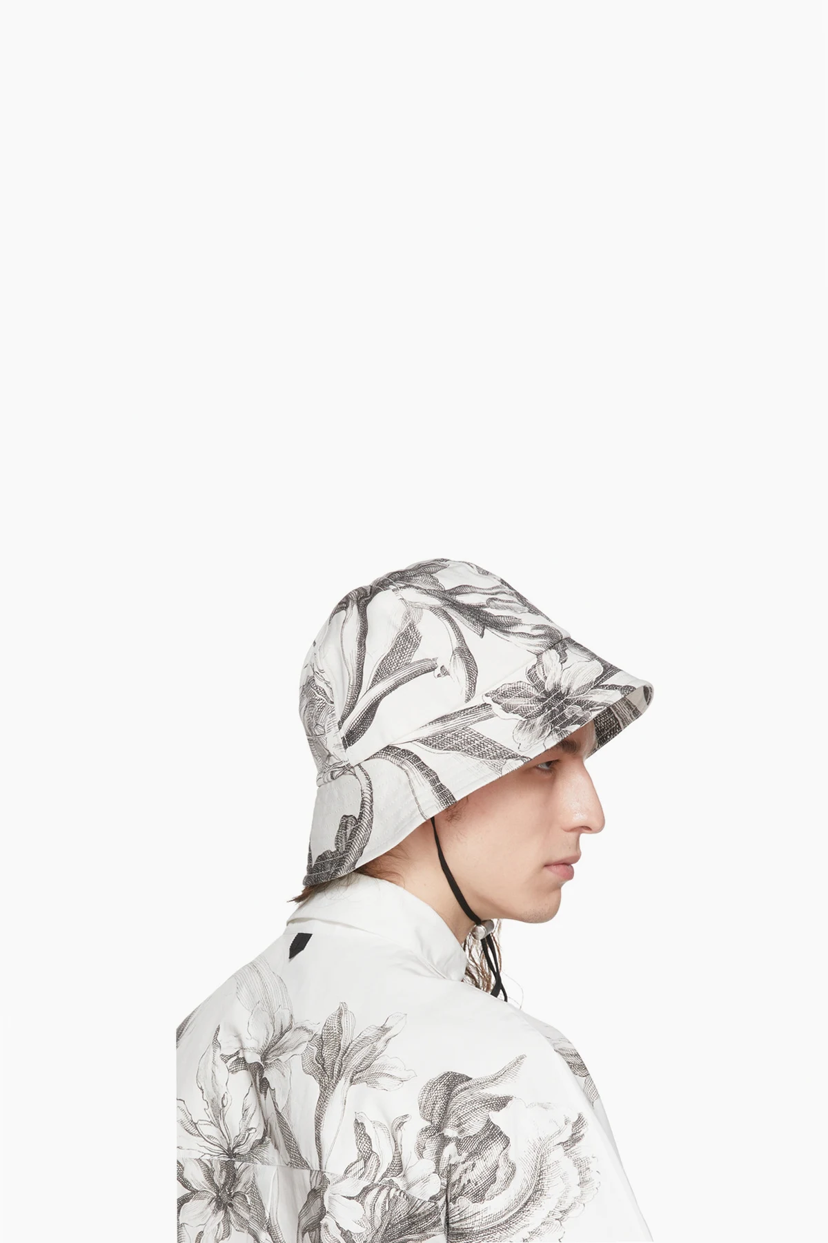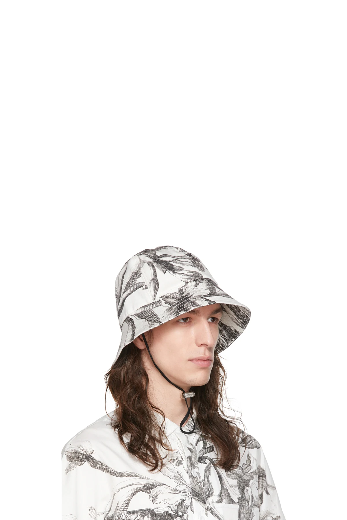 Paneled stretch denim bucket hat featuring graphic pattern printed throughout in black and white. Adjustable chin strap with logo-engraved cord-lock fastening.