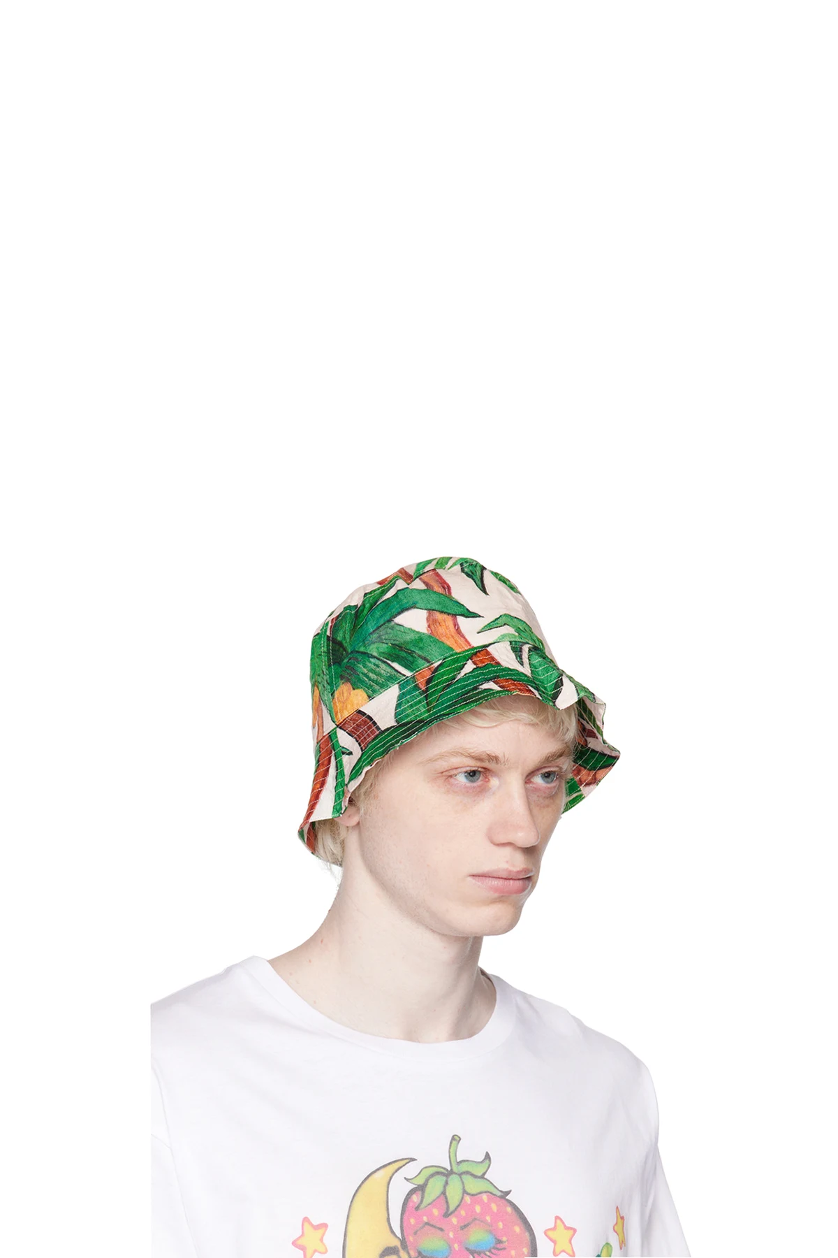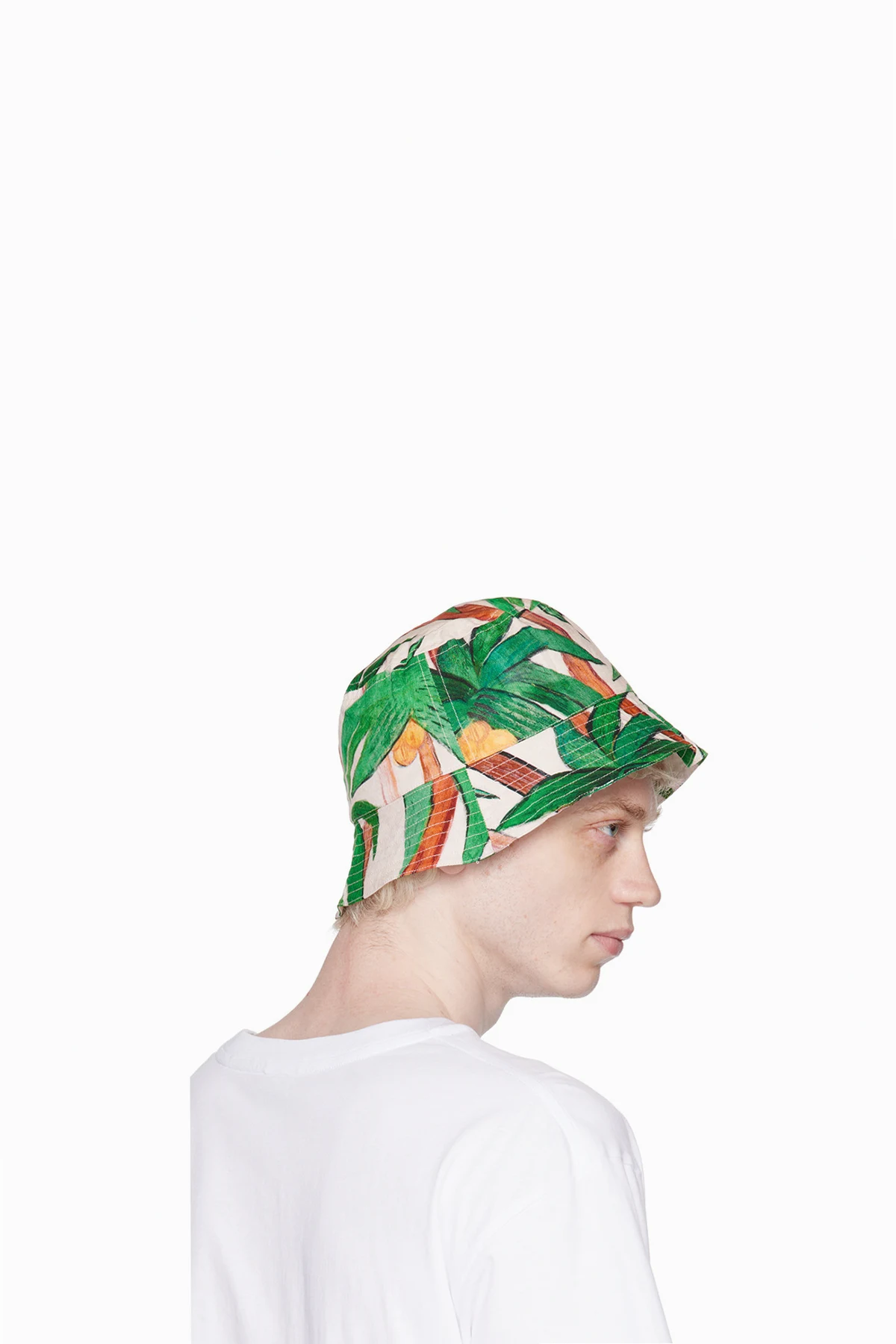 Plain-woven tencel bucket hat in beige. Graphic pattern printed throughout.