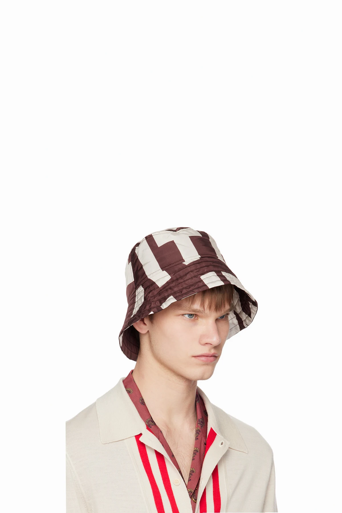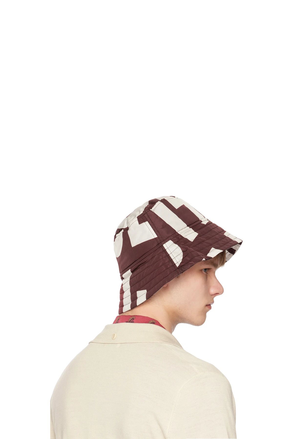 Nylon taffeta bucket hat in burgundy. Graphic pattern printed in off-white throughout.