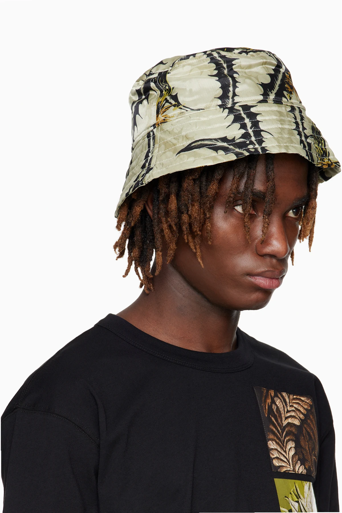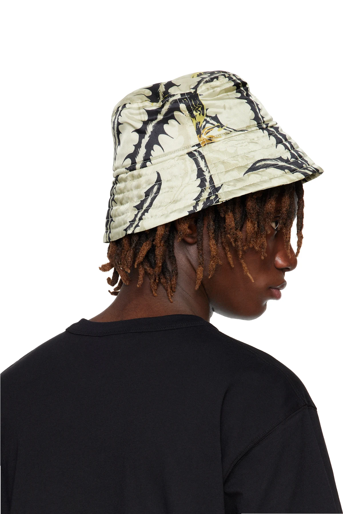 Viscose sateen bucket hat in yellow and black. Graphic pattern printed throughout.