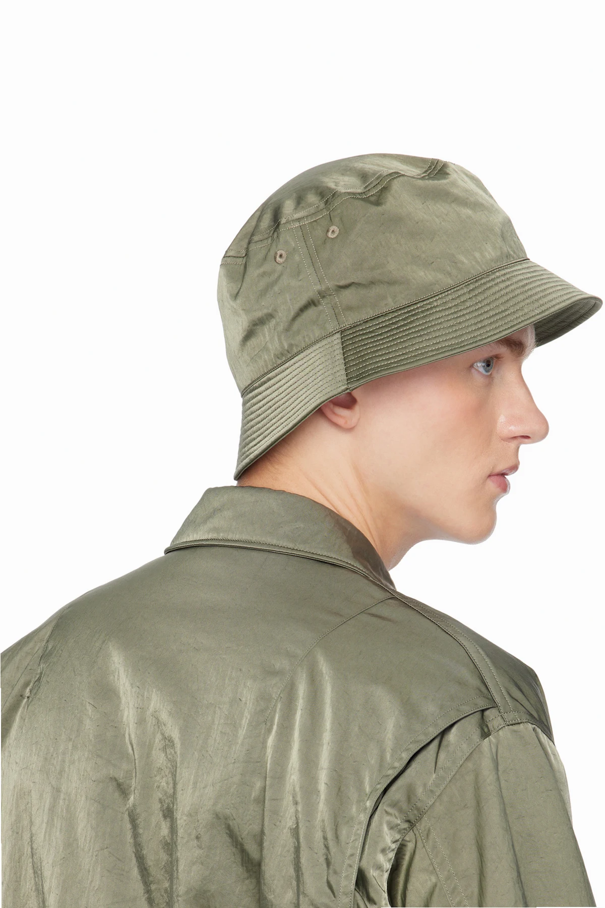 Crinkled nylon twill bucket hat in khaki.