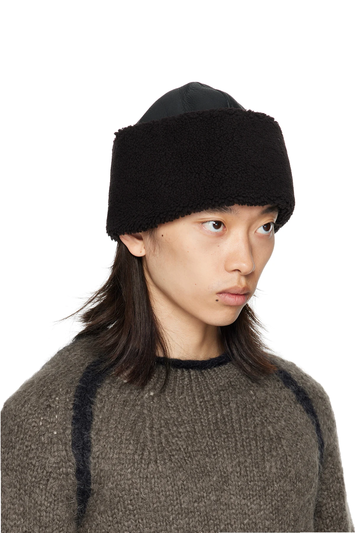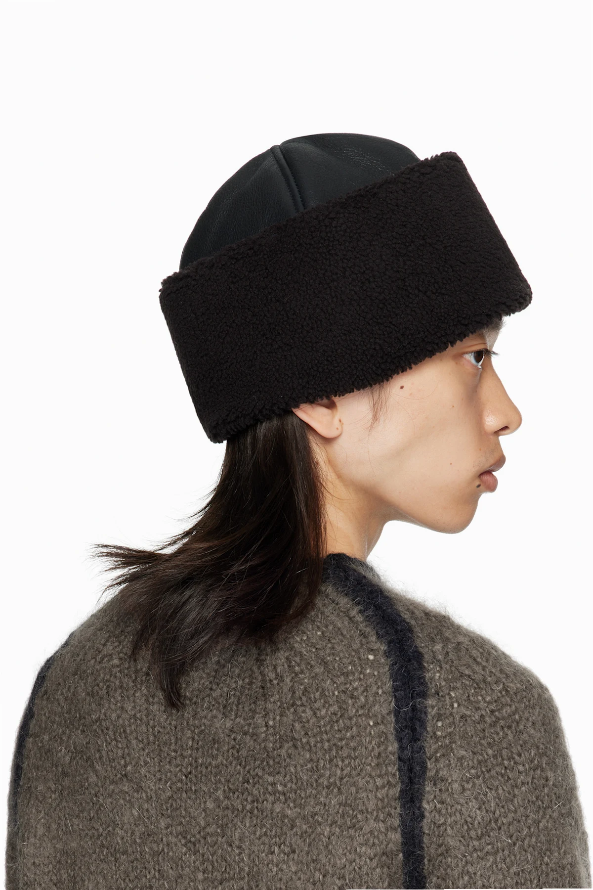 Grained lambskin hat. Shearling trim at rolled brim.