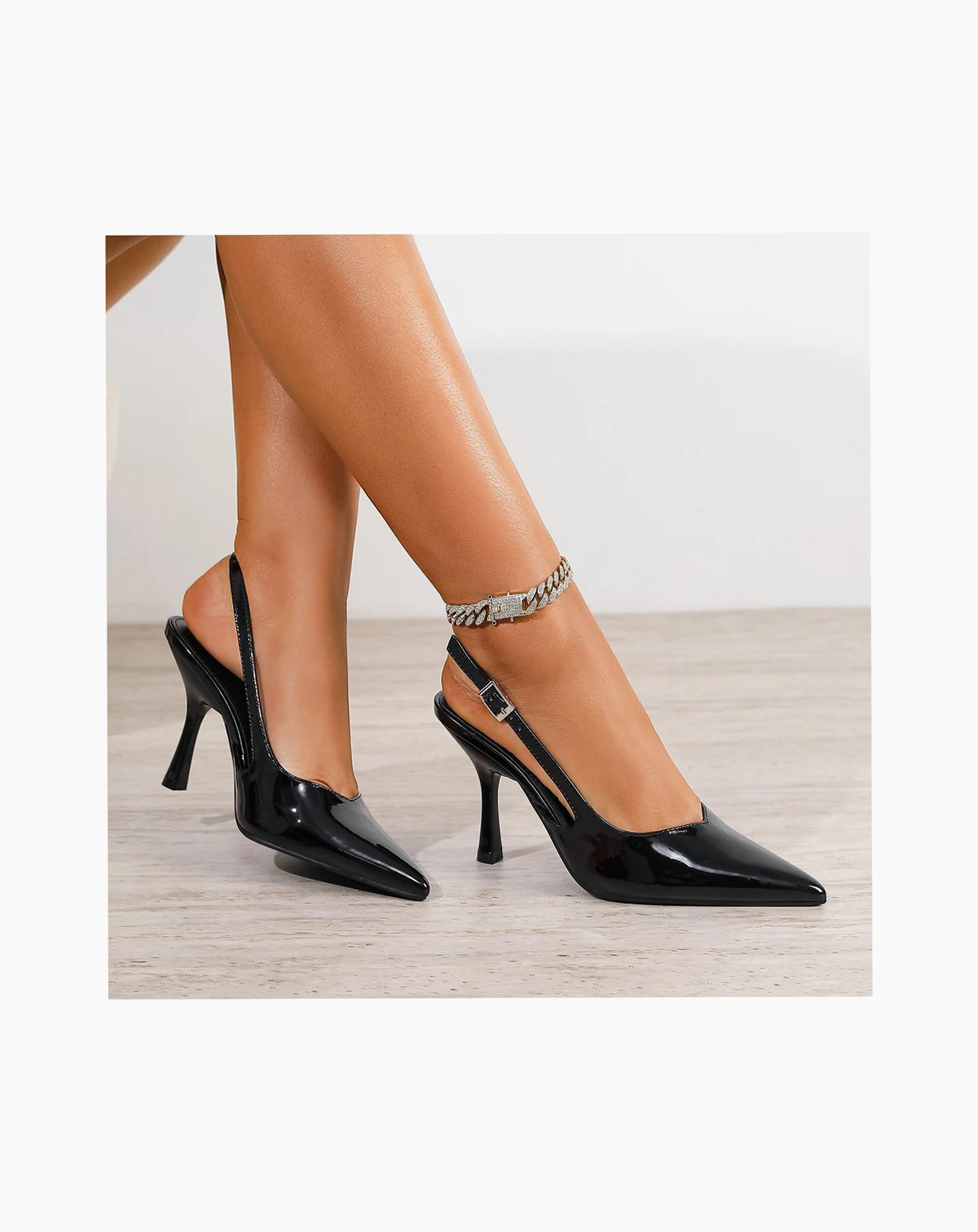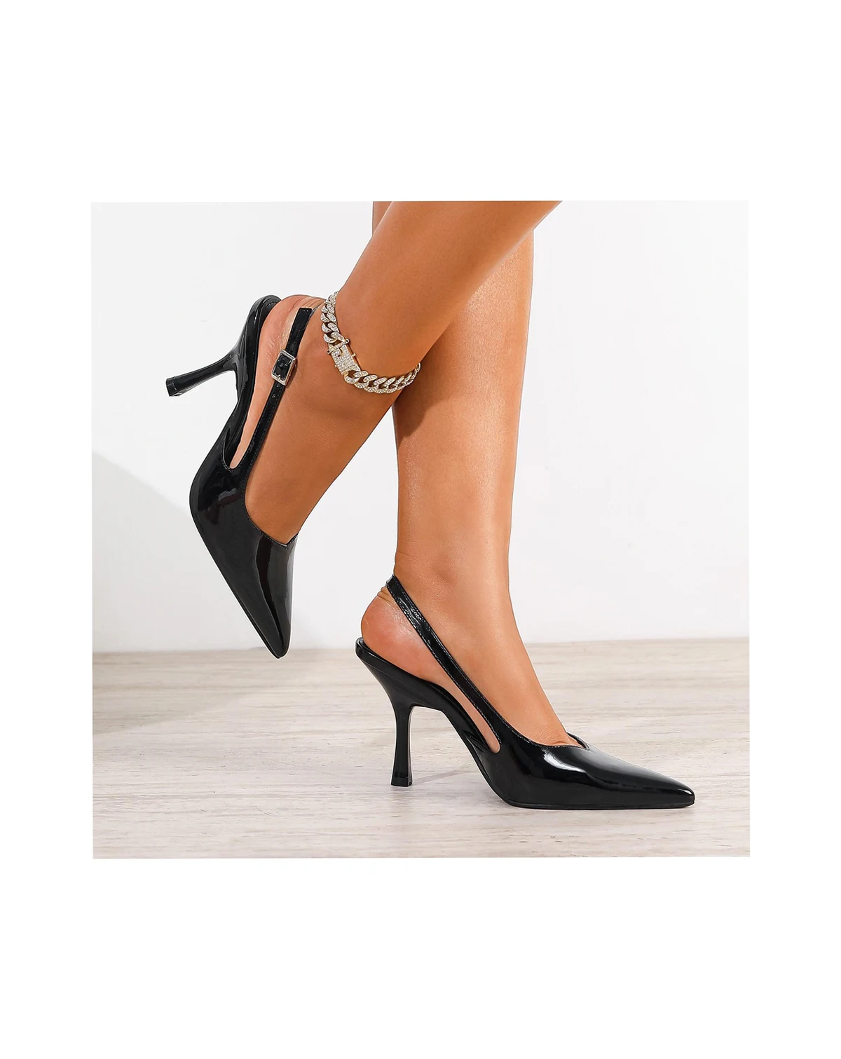 Sleek and sculpted, Carmel slingbacks redefine modern elegance. Crafted in glossy patent, they feature a sharp pointed toe and a slim heel that perfects any look.