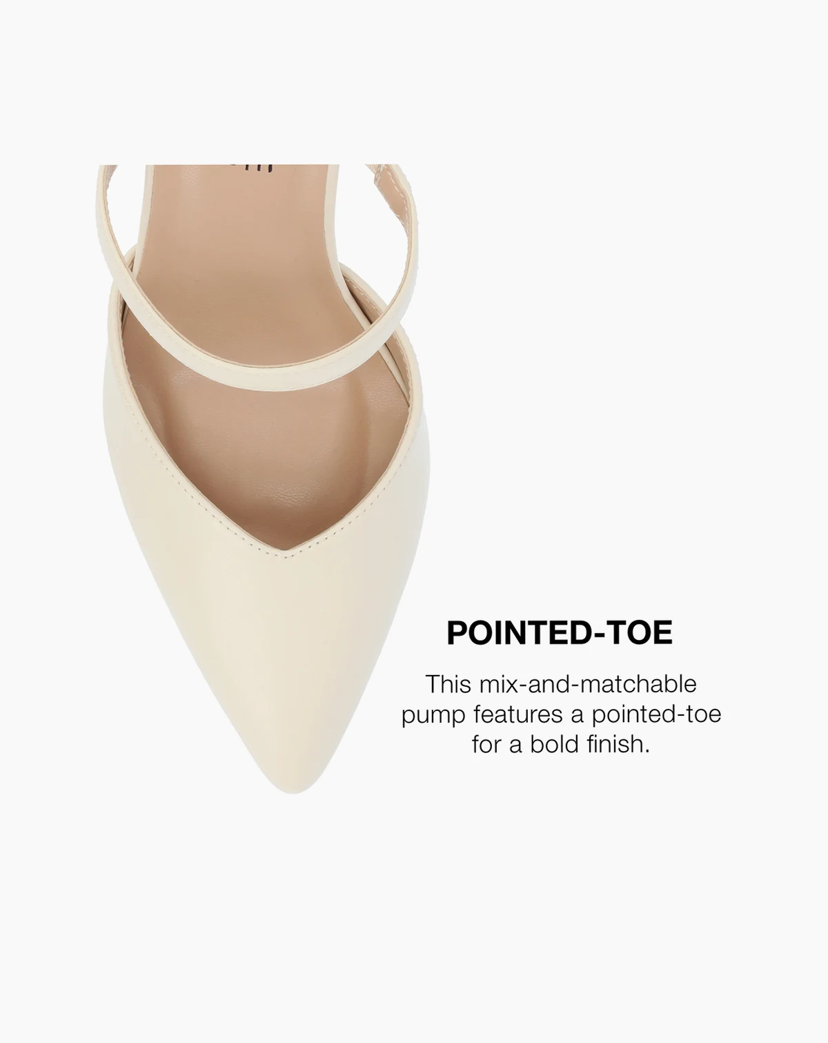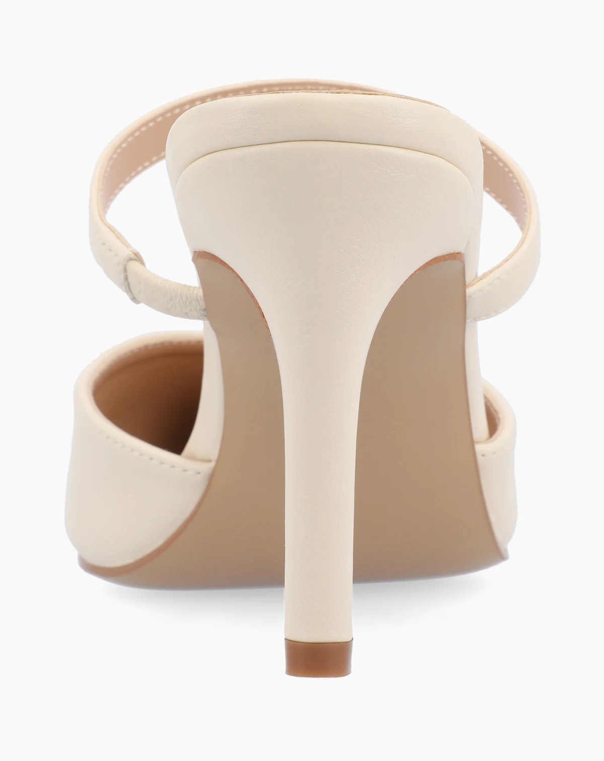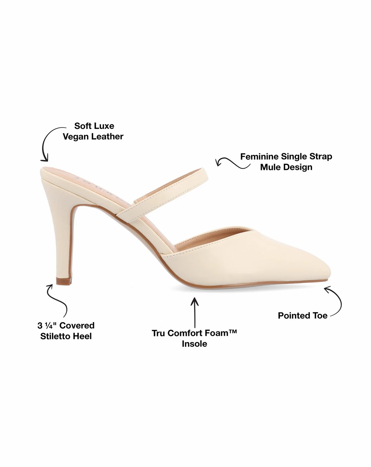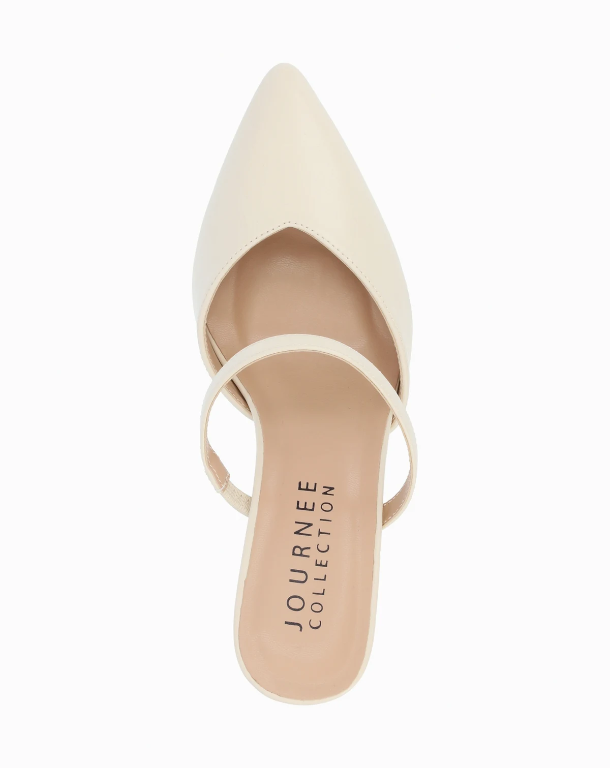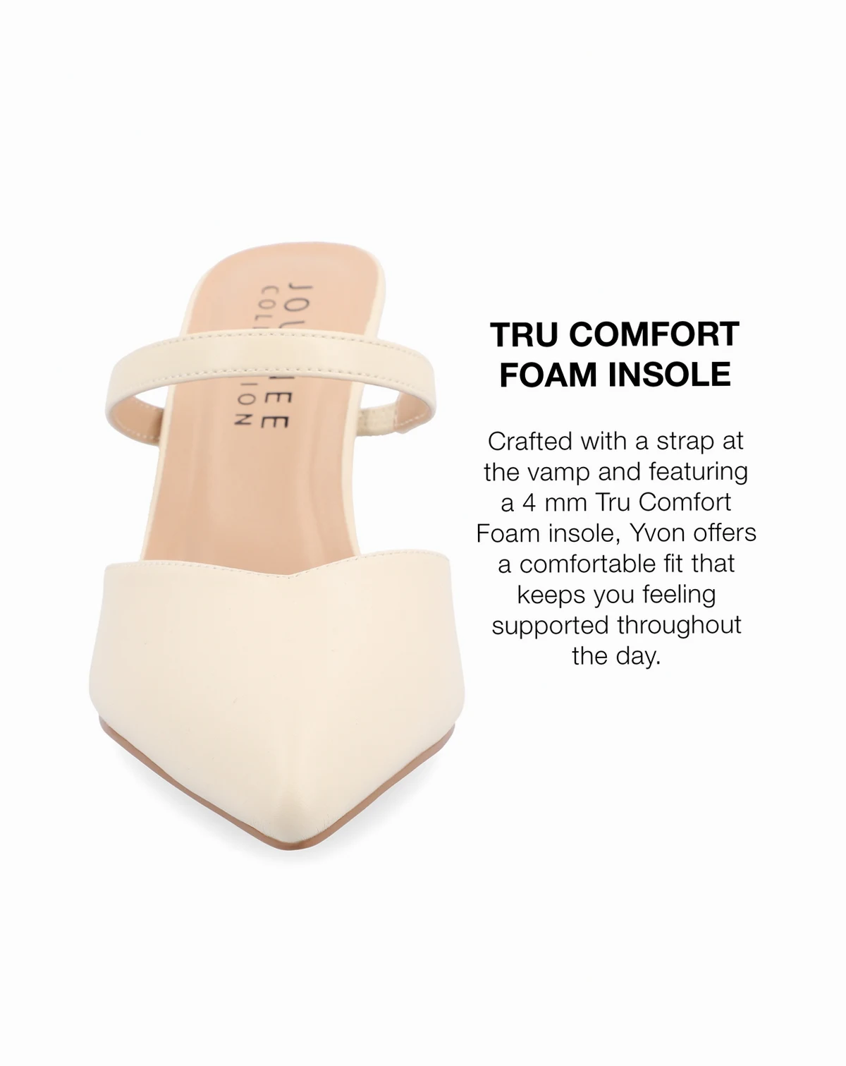 Introducing Yvon by Journee Collection, the slip-on pump that combines style and comfort effortlessly. With a range of shades and nude color options, Yvon features a pointed-toe design, a 3.25" stiletto heel, and a strap at the vamp, creating a sleek and sophisticated look. Crafted with faux leather and equipped with a cushioned insole, Yvon ensures both durability and comfort for all-day wear. The sweetheart topline adds a touch of elegance, making Yvon the perfect choice for any occasion.