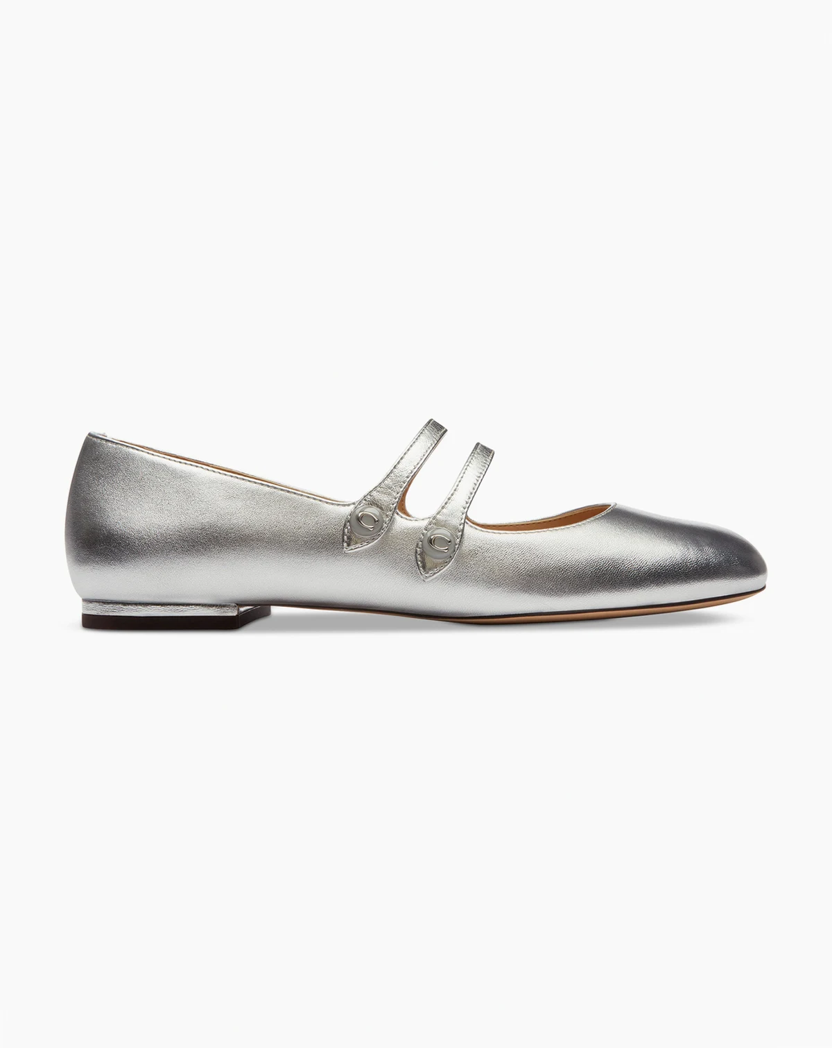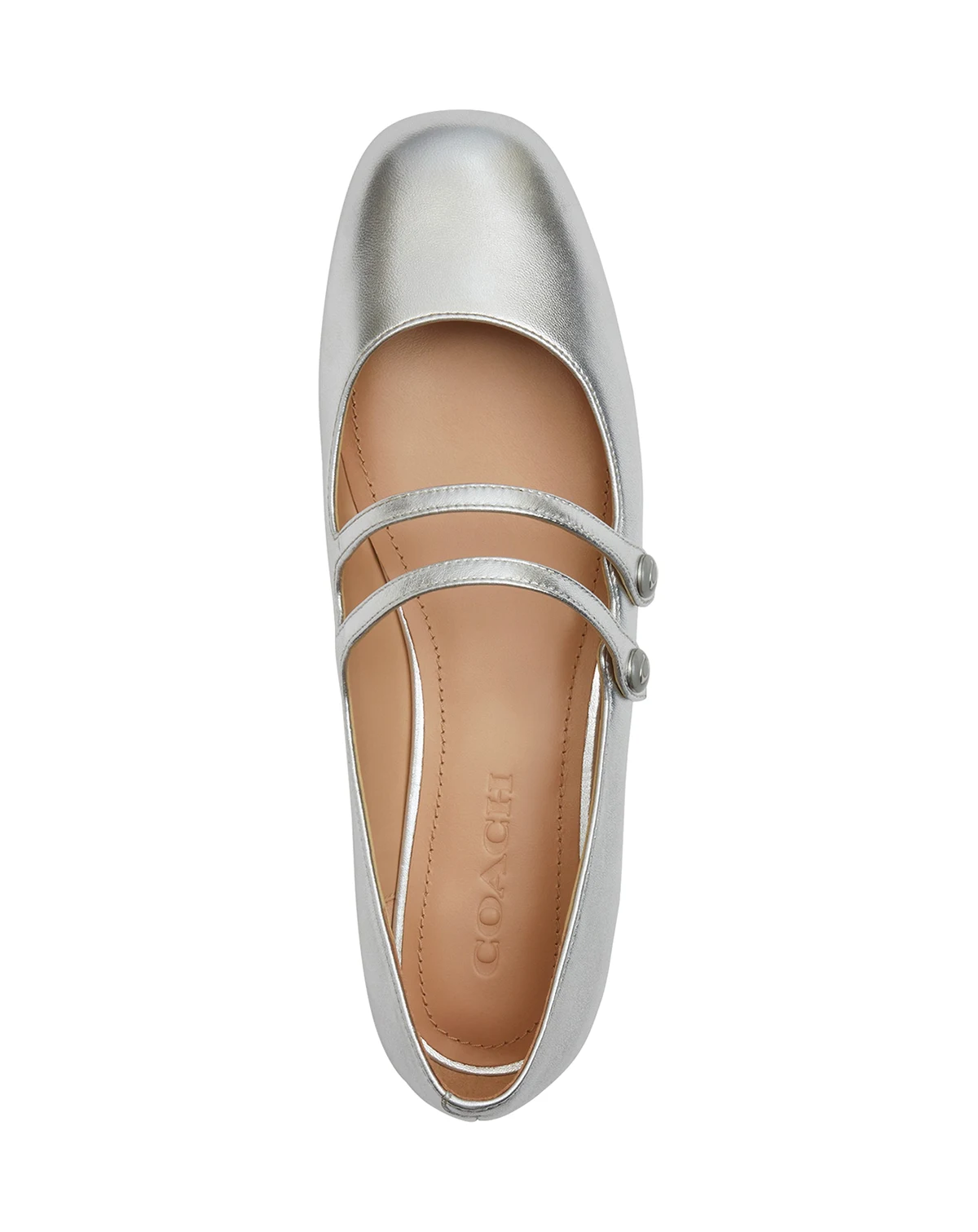 A duo of buckled straps and patent polish update the timeless Mary Jane feel of the Winley flats from COACH.