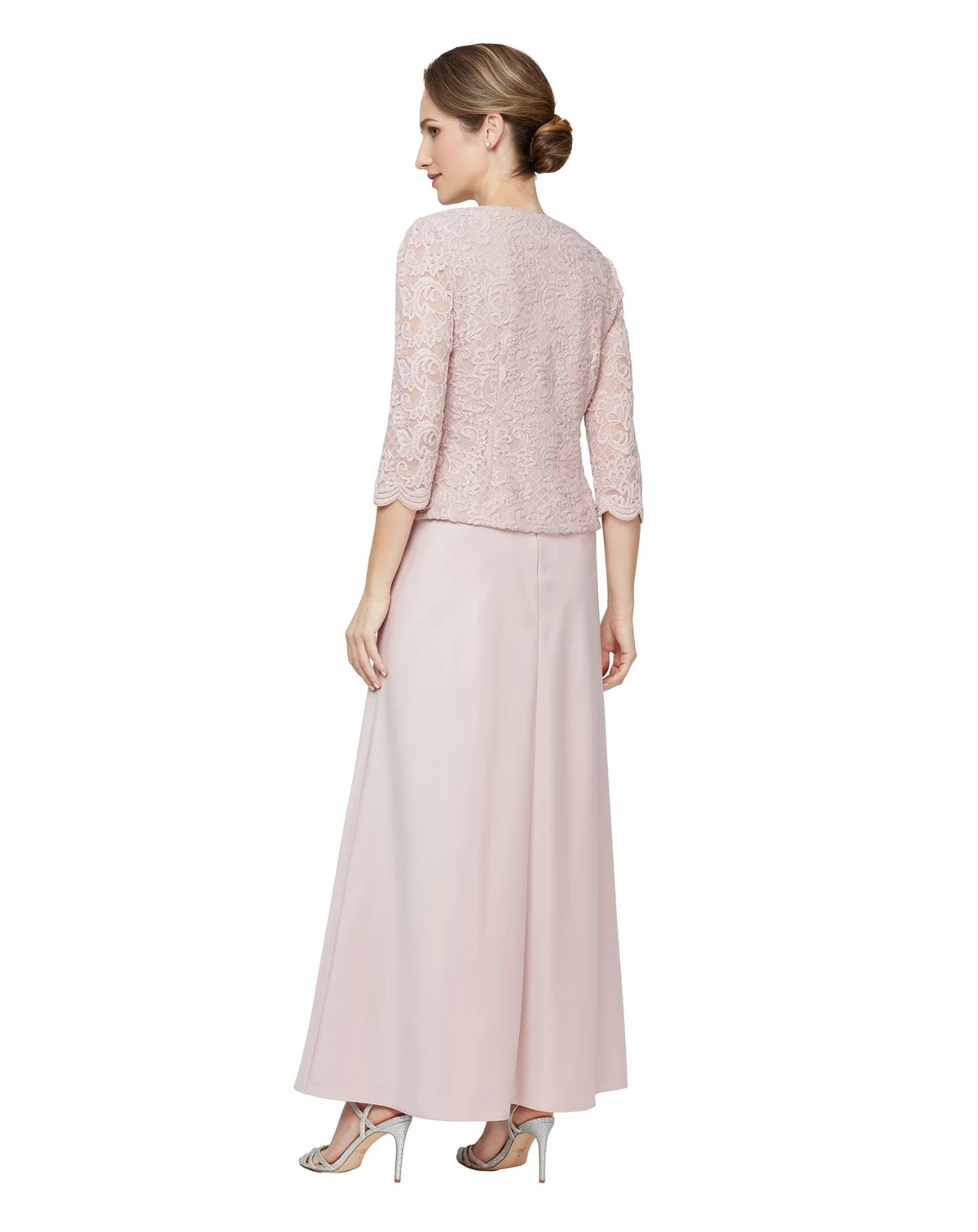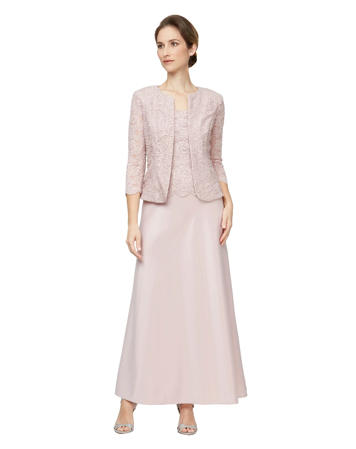 Approx. 51" long from center back neck to hem. Length is based on size 8P and varies 1/4" between sizes; Designed to fit and flatter 5'4" and under frame; Jacket: approx. 19-3/4" long, crew neck, open front, 3/4-length sleeves, shoulder pads, allover lace