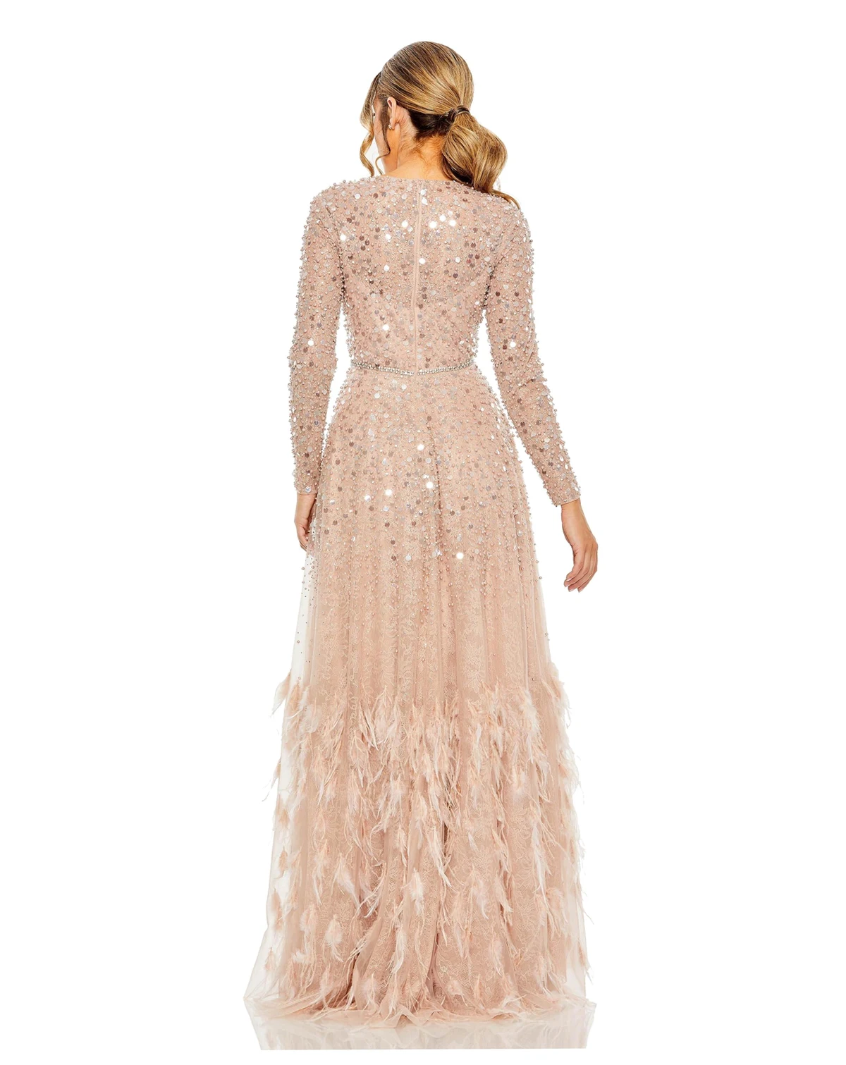Elegant long-sleeve evening gown featuring allover shimmering sequin embellishments, a refined bateau neckline, and a defined waist with subtle sparkle trim. Designed to flatter with a graceful, floor-length silhouette perfect for formal events and special occasions.
