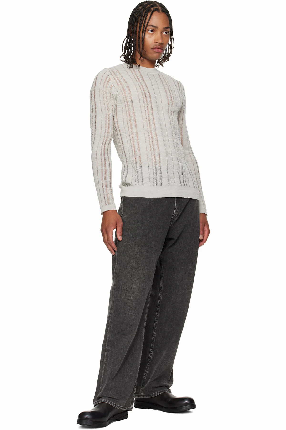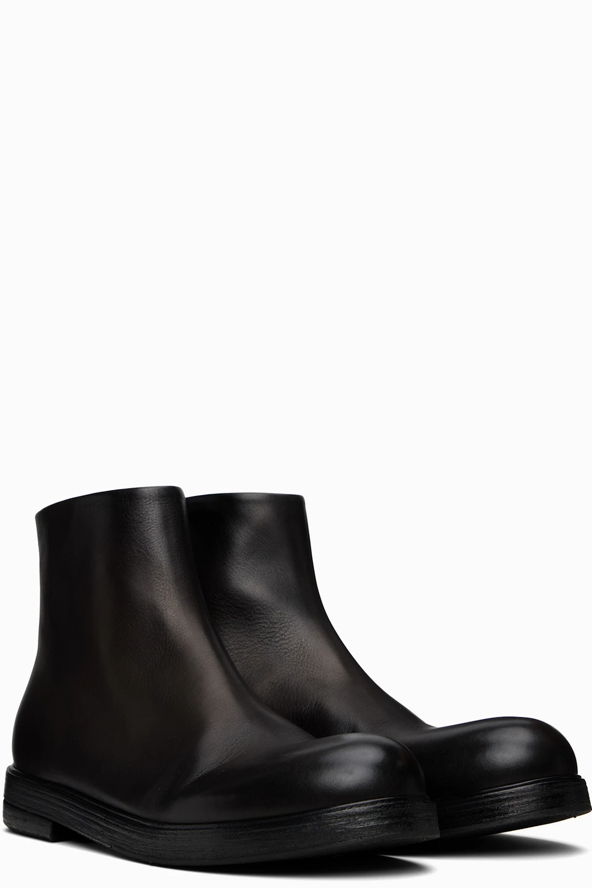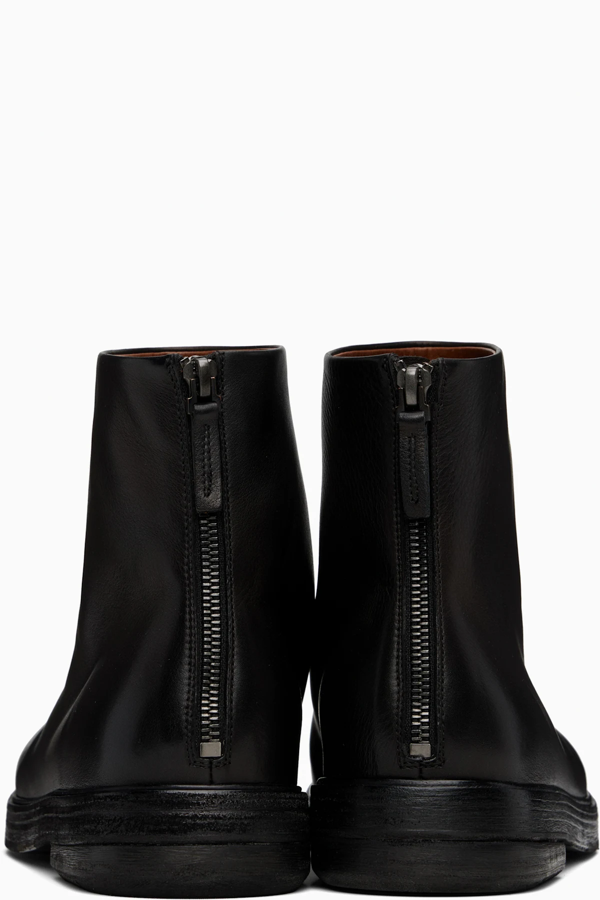 Ankle-high buffed leather boots.