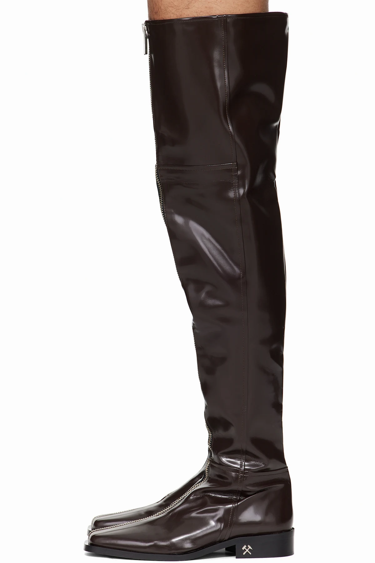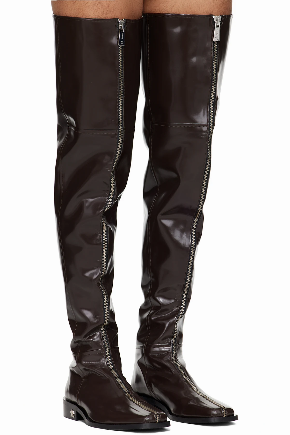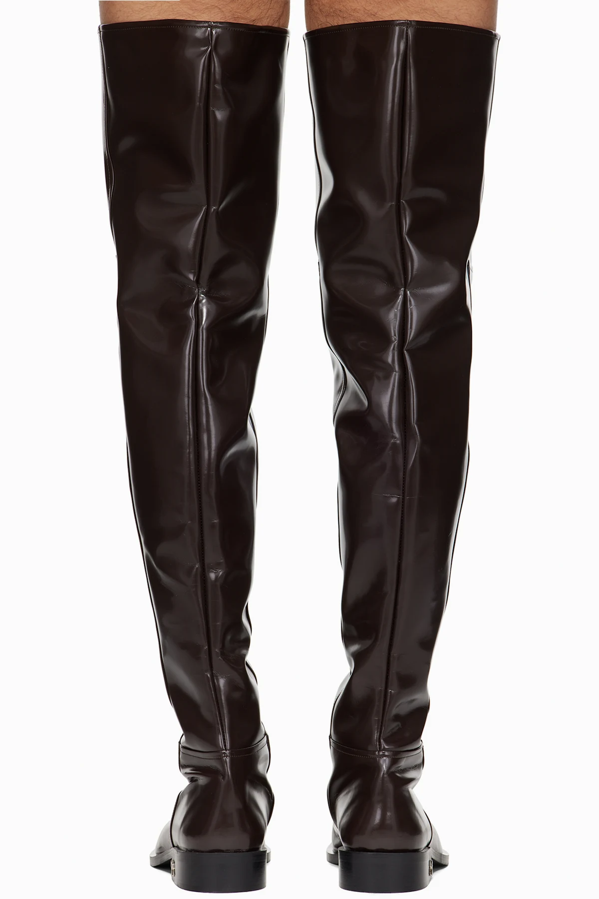 Over-the-knee polished faux-leather boots.