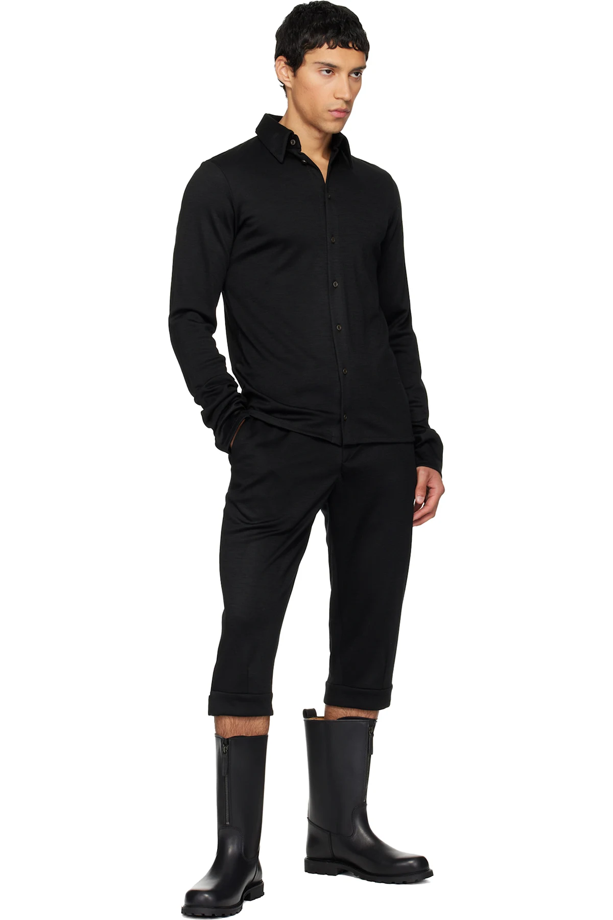 Mid-calf buffed leather boots.