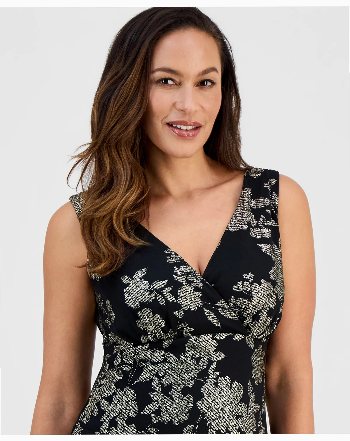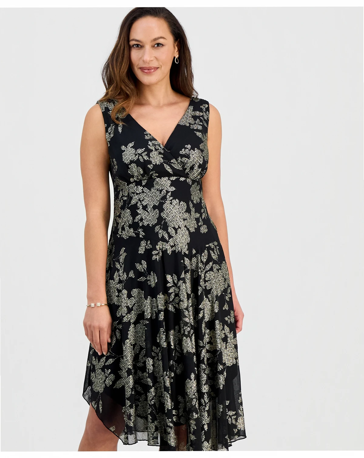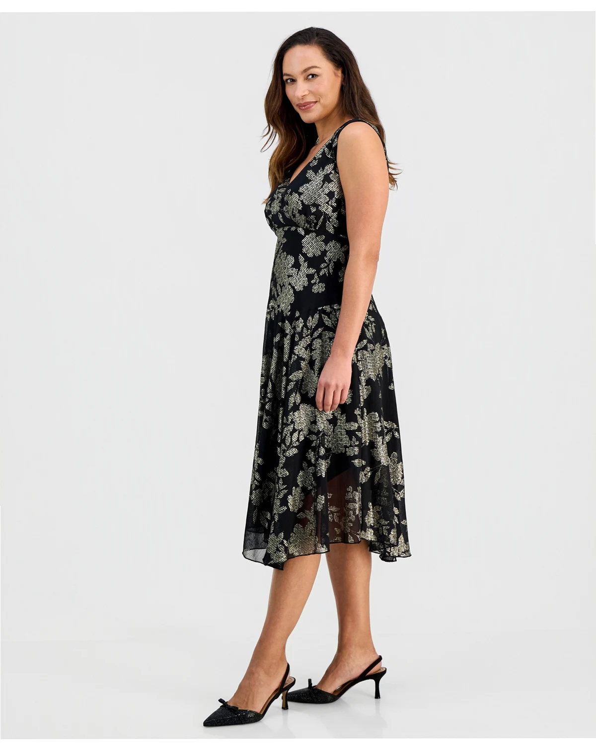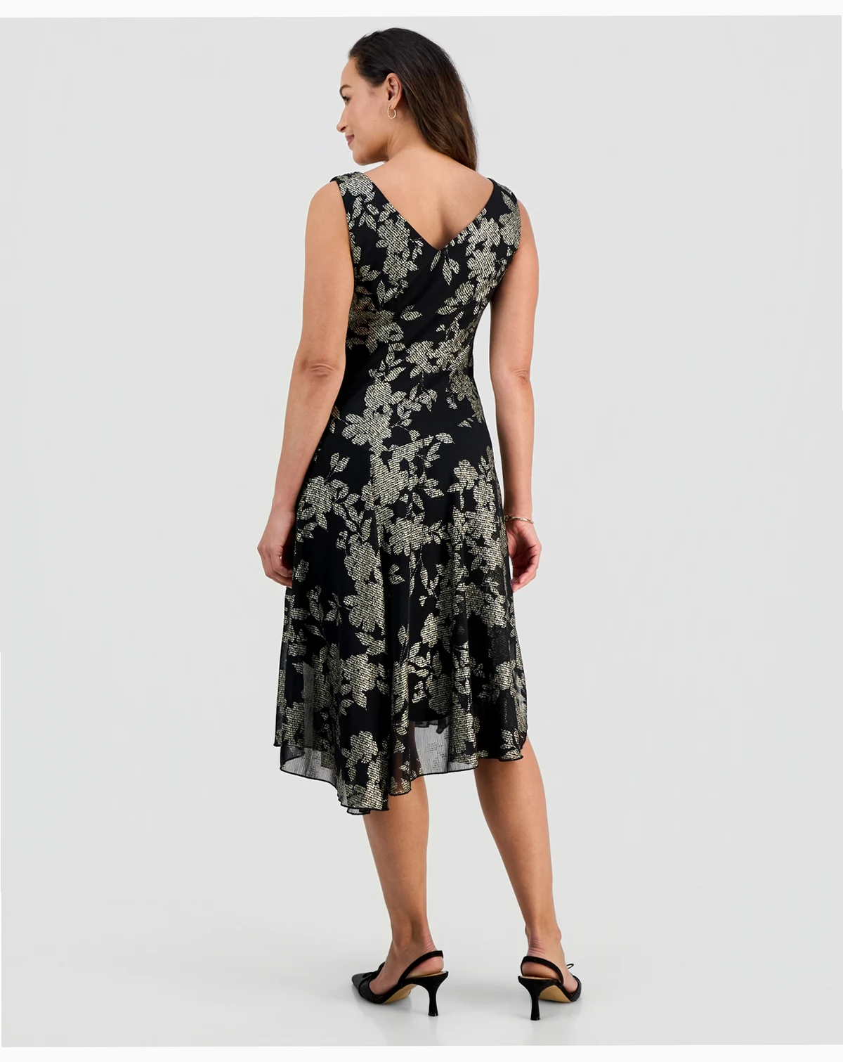 A swingy asymmetric hem brings dynamic movement to this petite sleeveless midi dress from Connected, making the stylish metallic floral print design a perfect choice to wear when you're dancing all night.