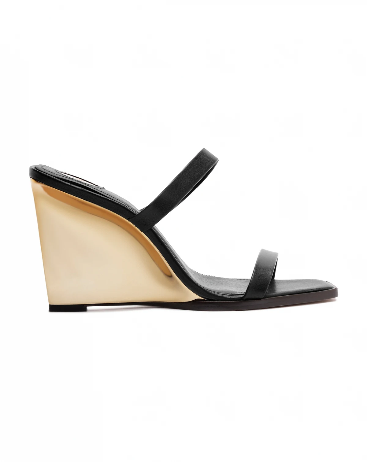 Where effortless meets elevated. The Alex Wedge Sandal brings a touch of shimmer to your wardrobe with its gleaming gold wedge and minimalist two-band design. Perfect for making memories from sunrise to starlight.