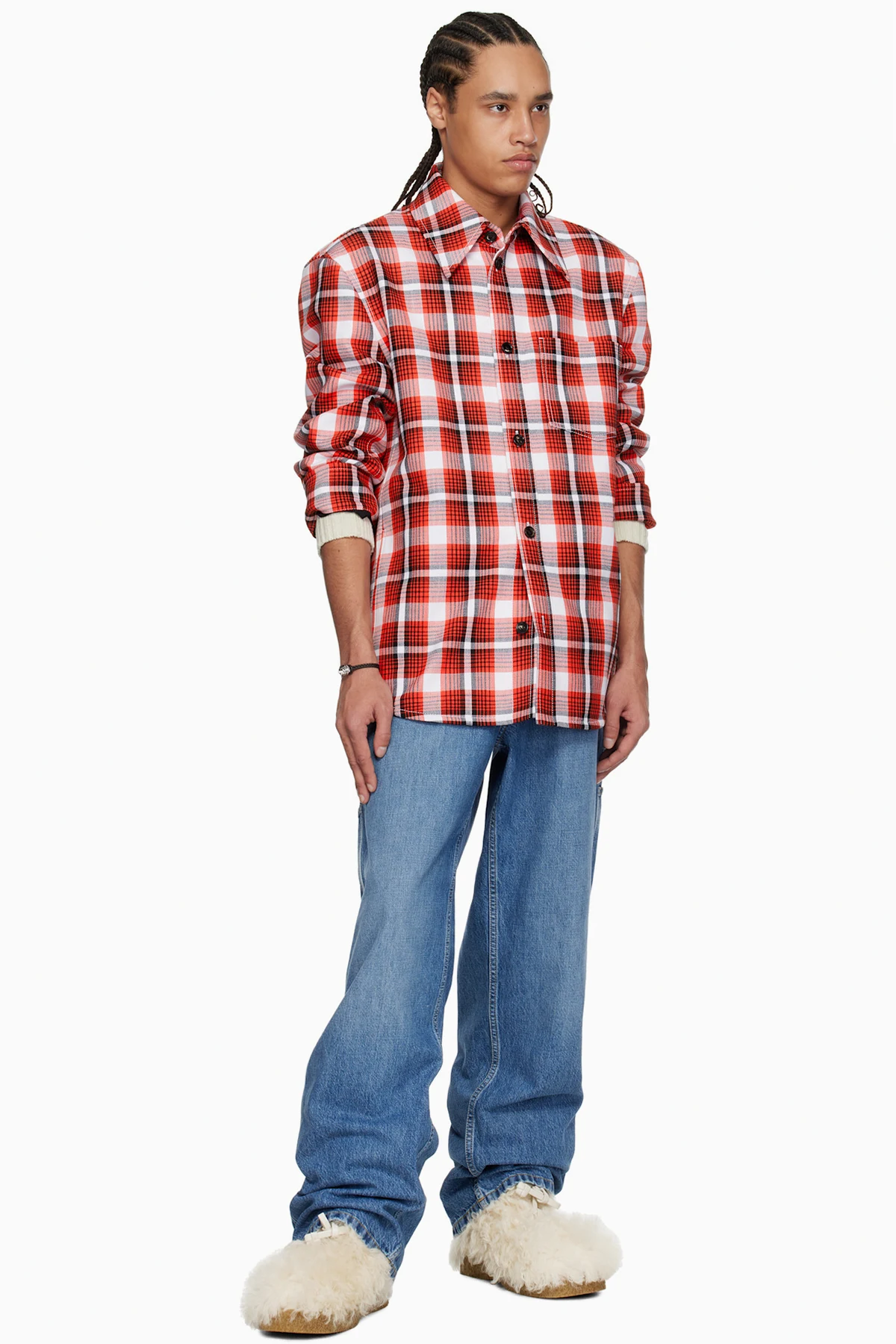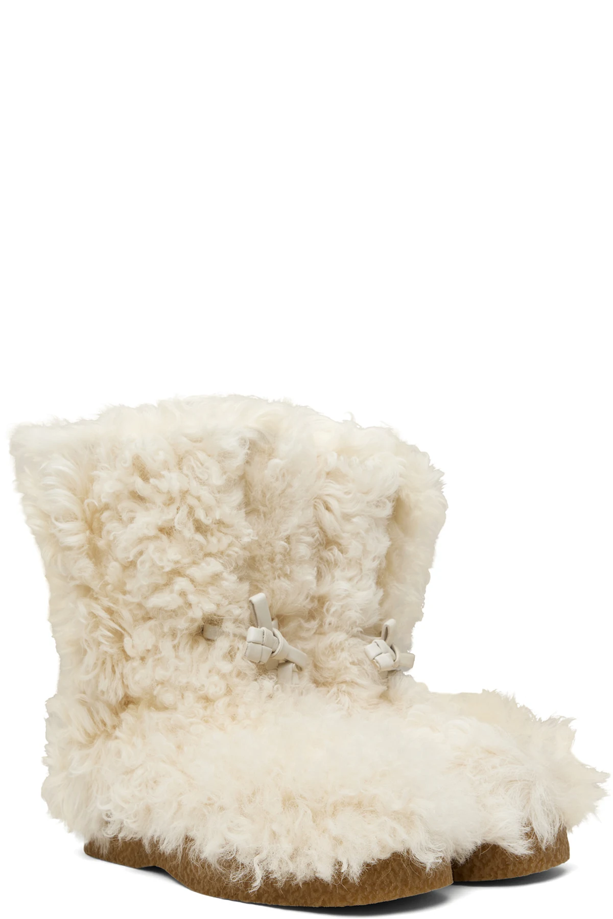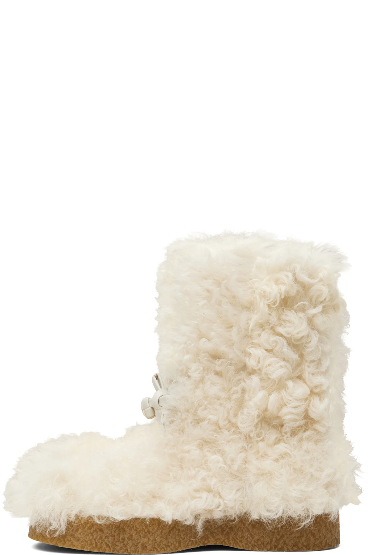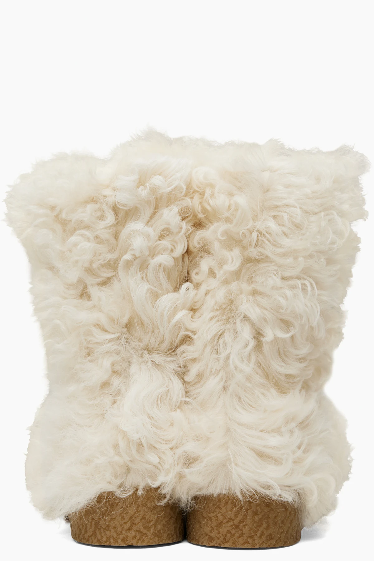 Calf-high shearling boots in off-white.
