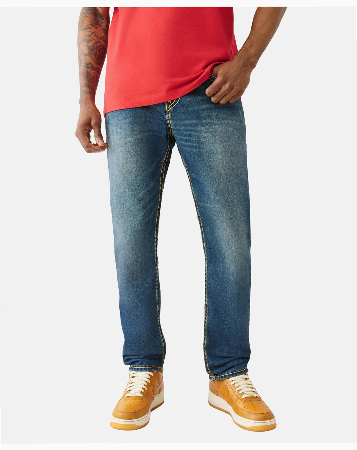 Make a statement in the Rocco Super T Skinny Jean. This pair of Men's Jeans feature a zip fly, belt loops, and contrasting Super T stitching. Finished with horseshoe detailing on the back pockets and a 32" inseam.