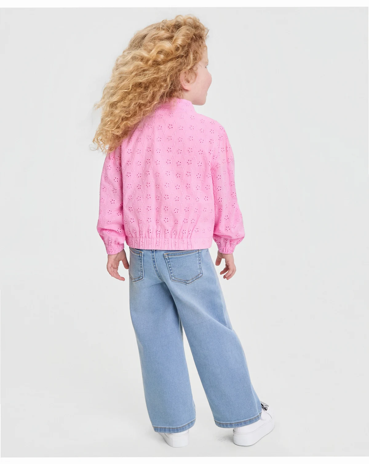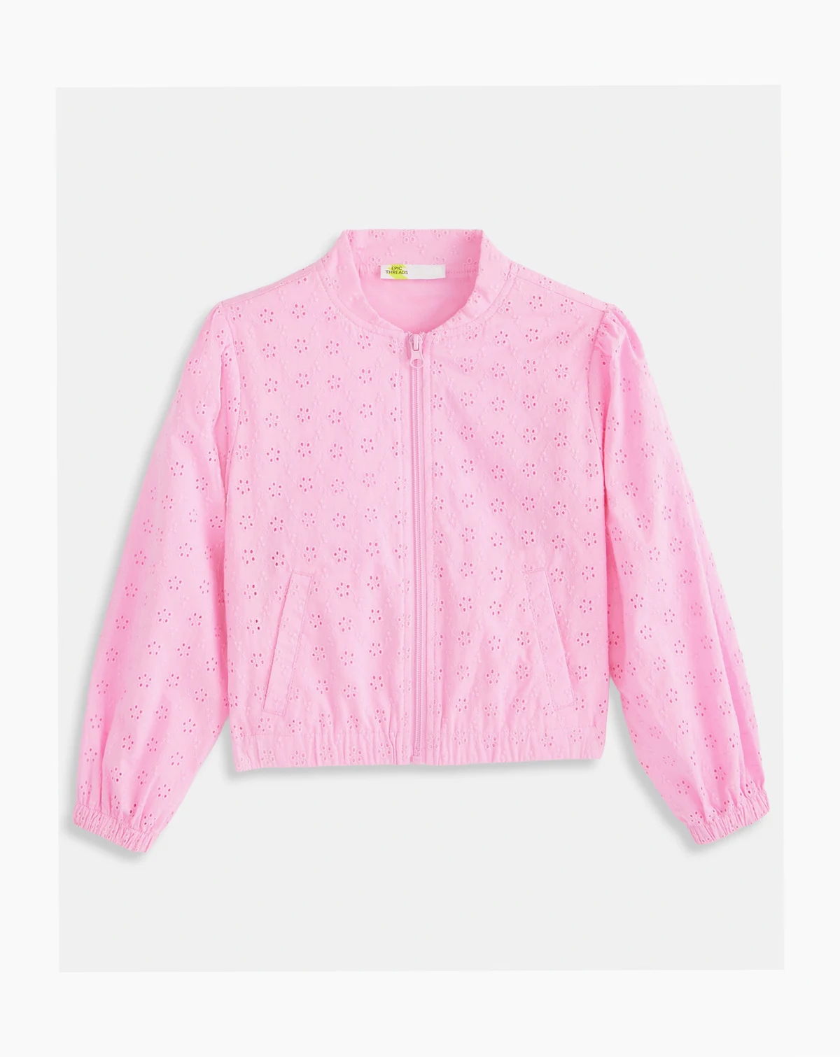 Top off your little girl's looks in sweet style with this cotton eyelet bomber jacket from Epic Threads.
