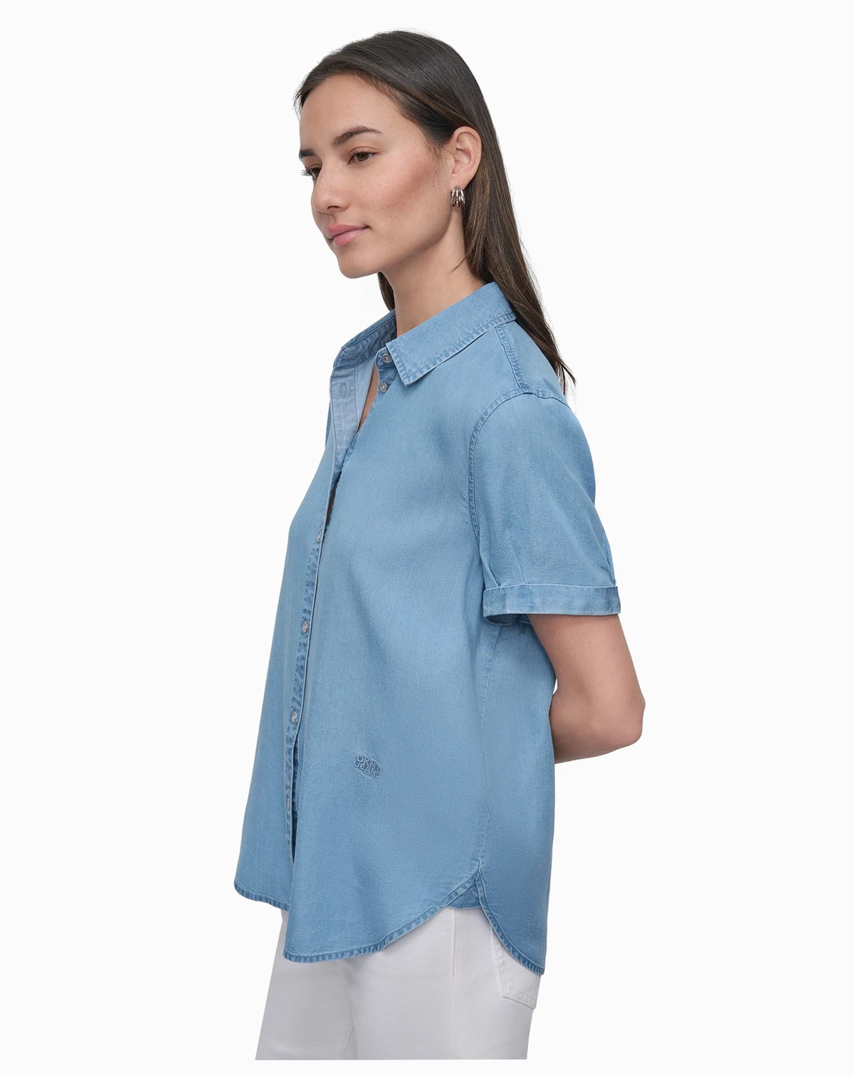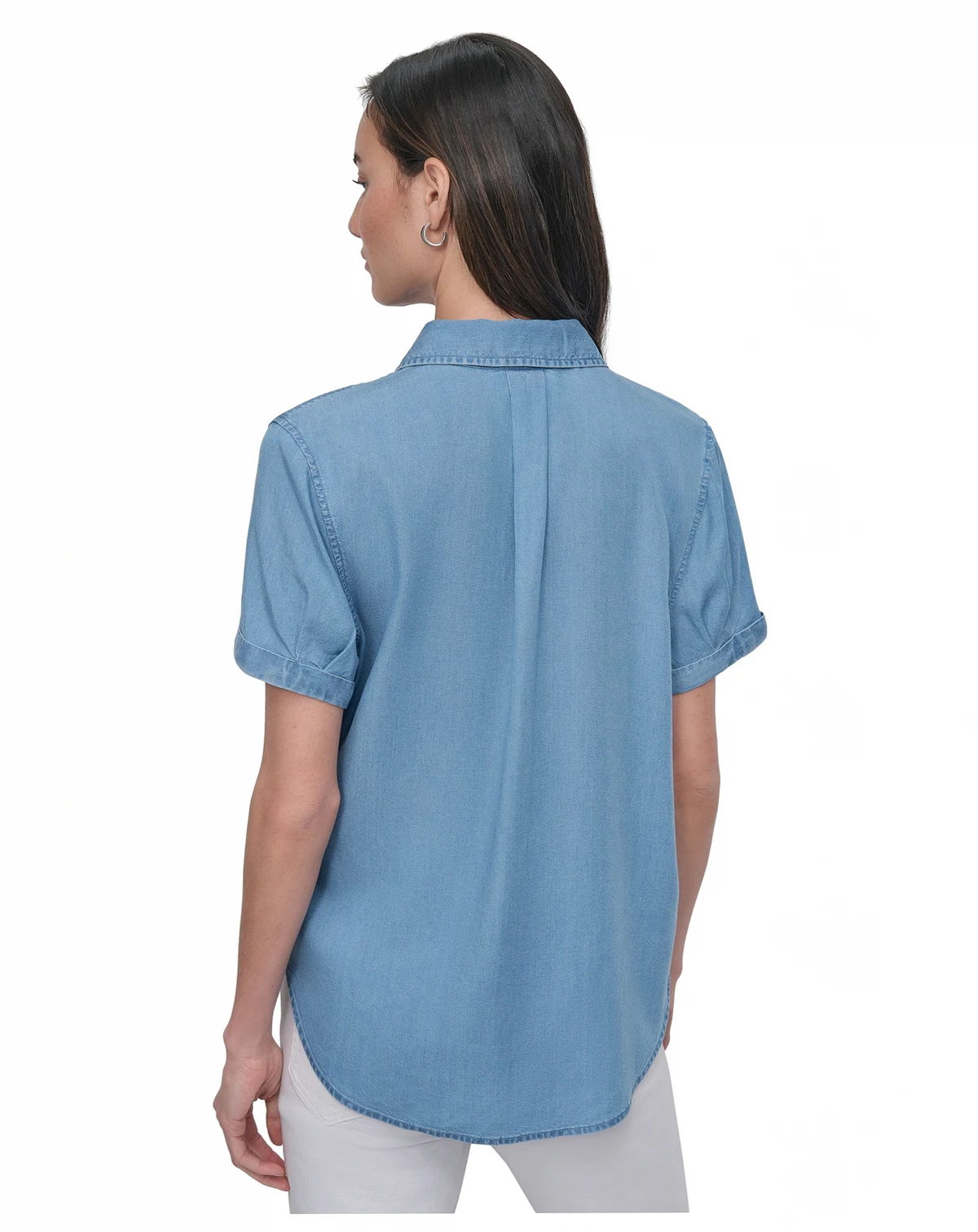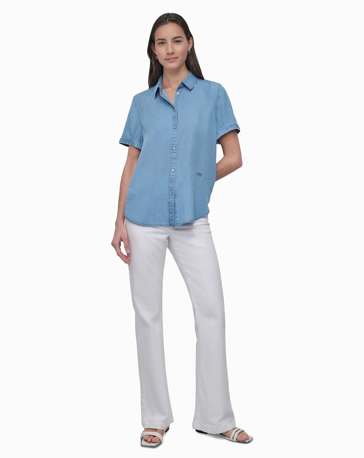 A relaxed take on the button-up shirt, this style from DKNY Jeans has an easygoing fit and short, rolled sleeves.