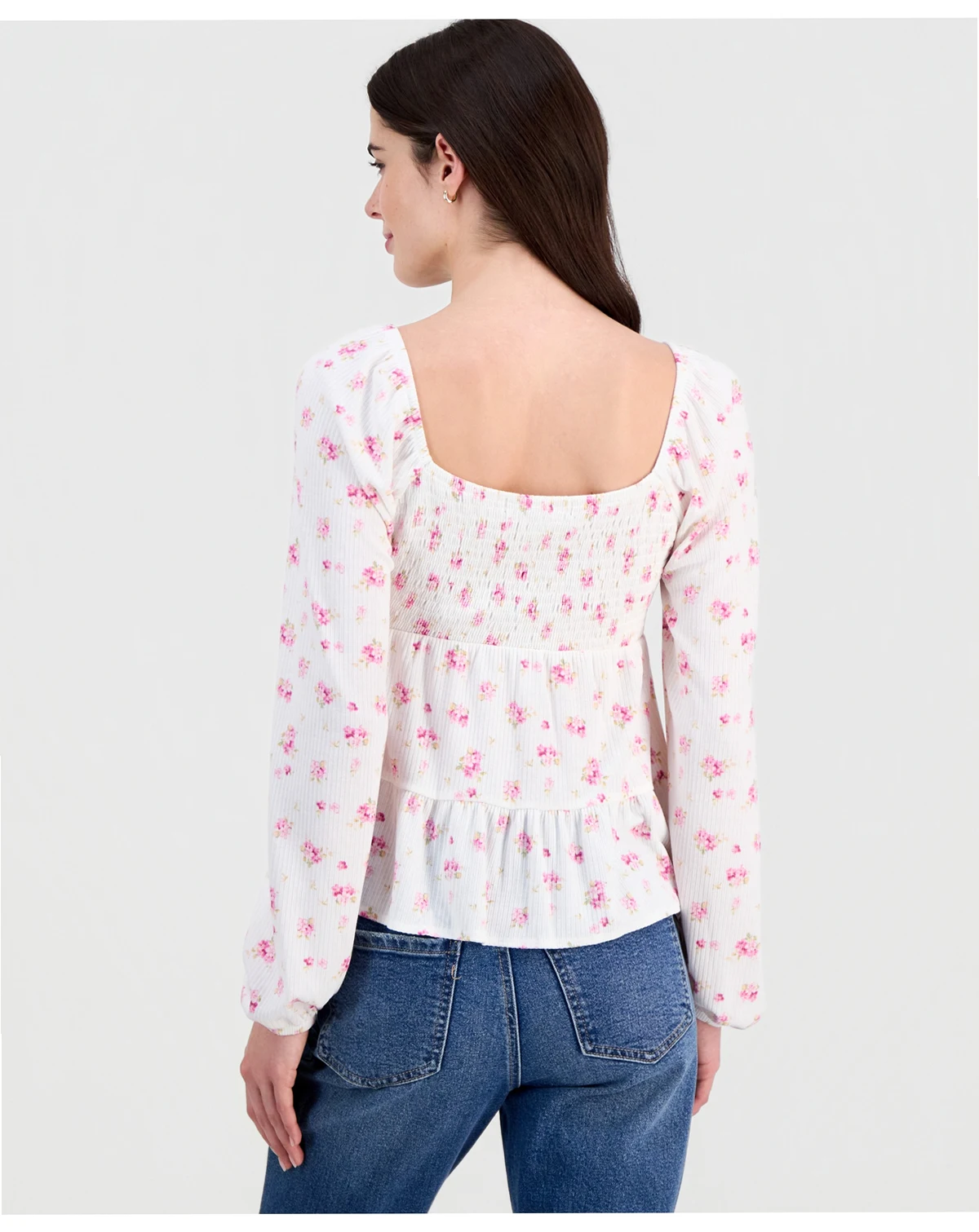 Sweet and stylish, this babydoll top from Madden Girl gets it right with a square neckline, smocked bust and tiered hem.