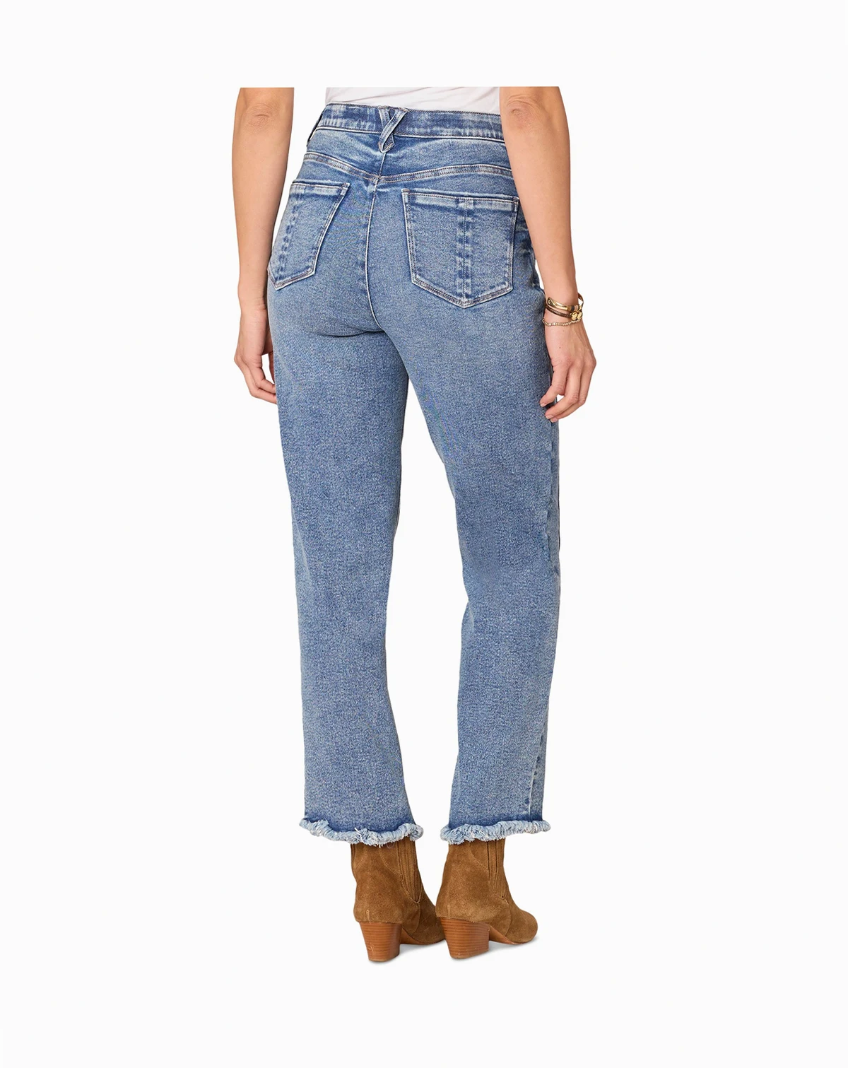 A chic straight leg silhouette is elevated thanks to an edgy spliced seam and step hem design, featuring Democracy's "Ab"solution technology that boosts your assets.