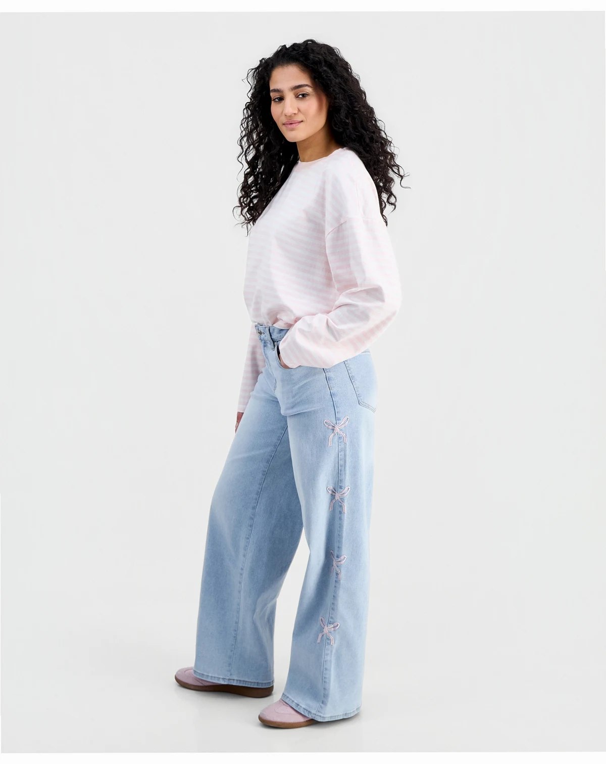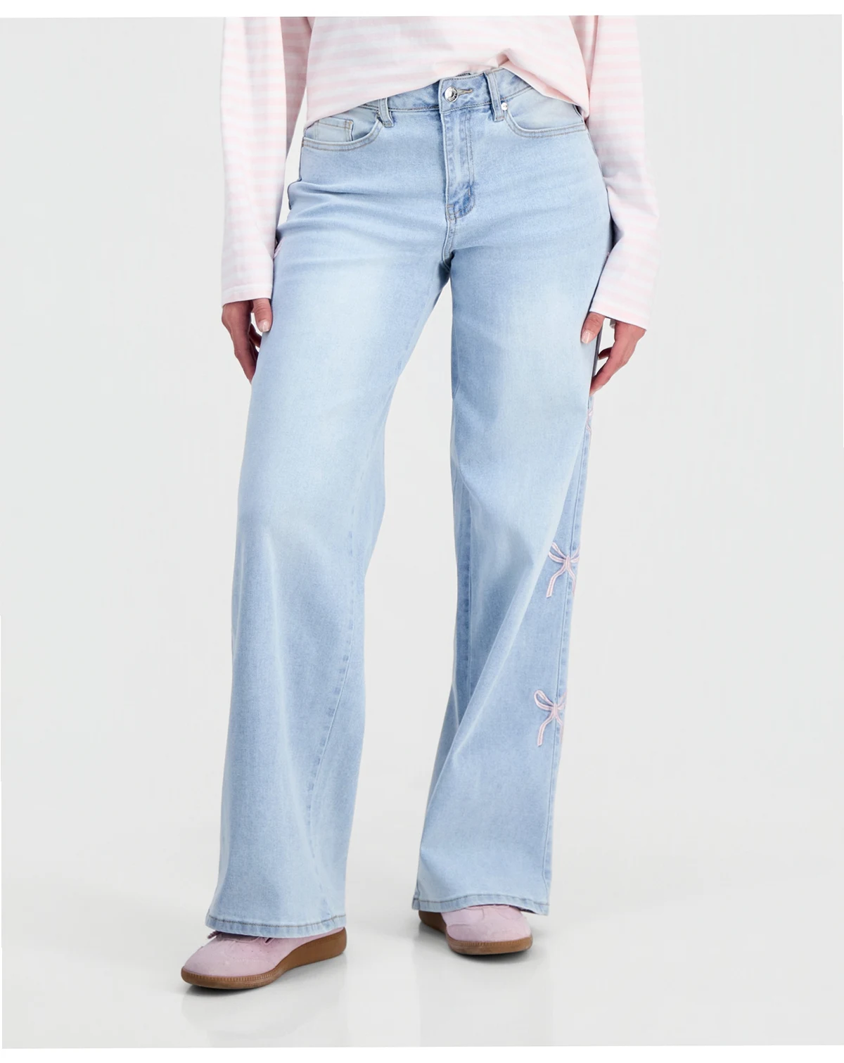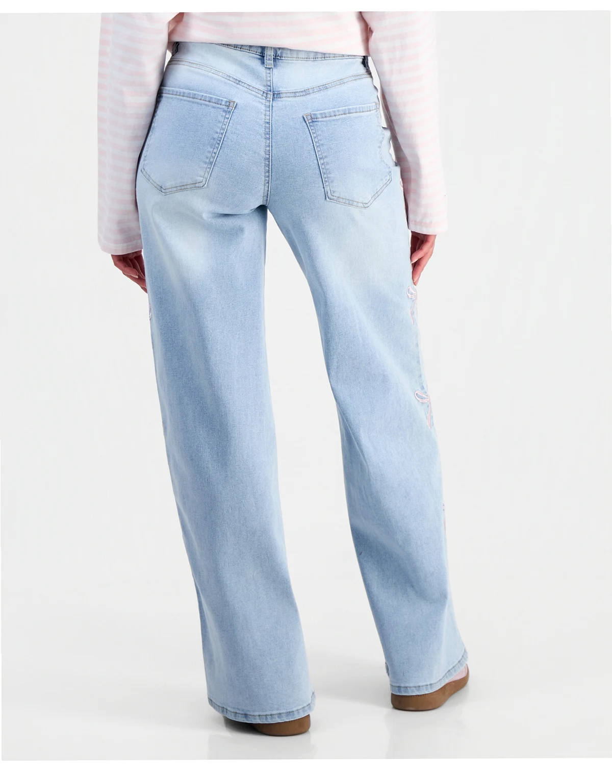 Madden Girl puts a new twist on a pair of slouchy wide-leg jeans with embroidered bows down the sides of the legs. Wear them with a cropped sweater or a fitted T-shirt.