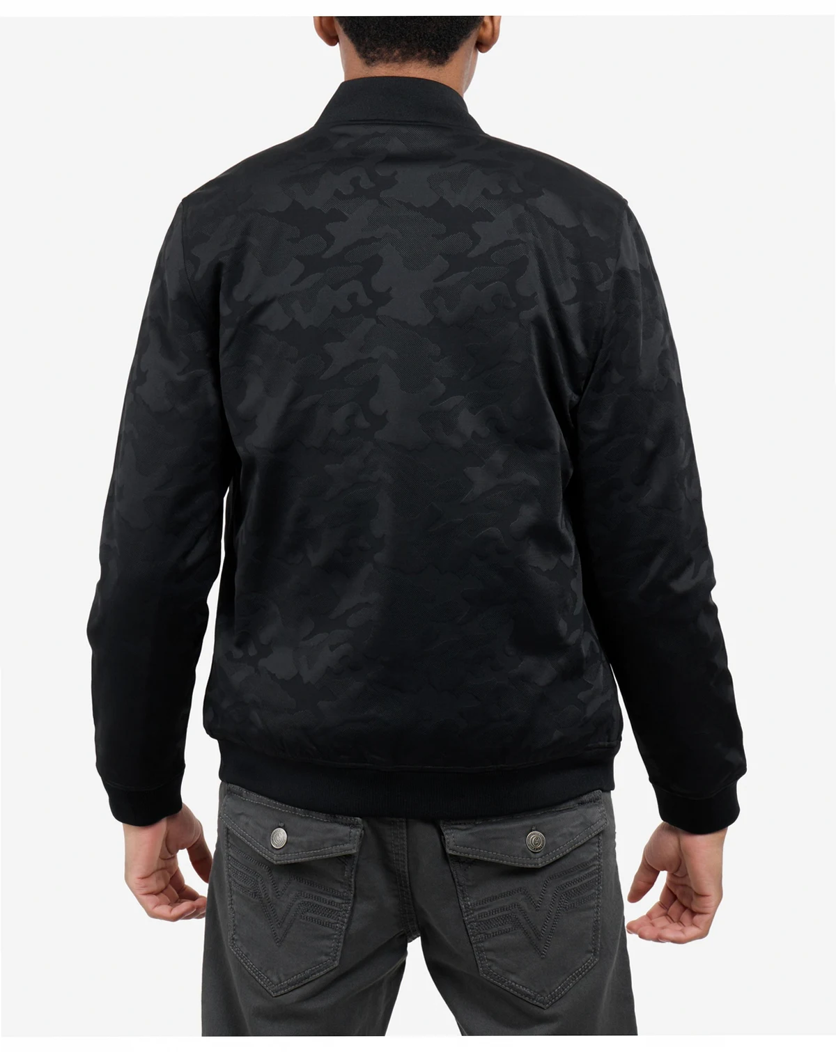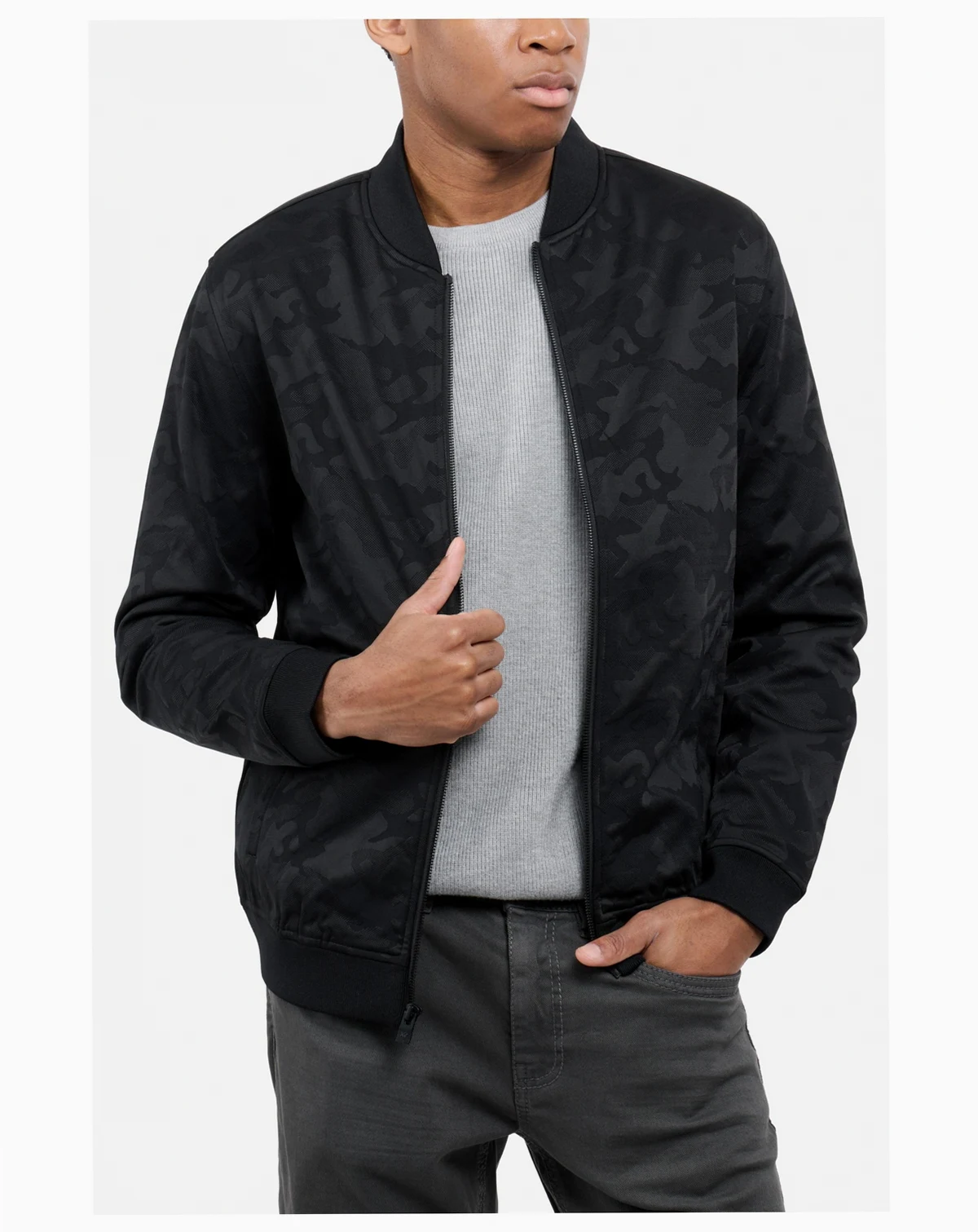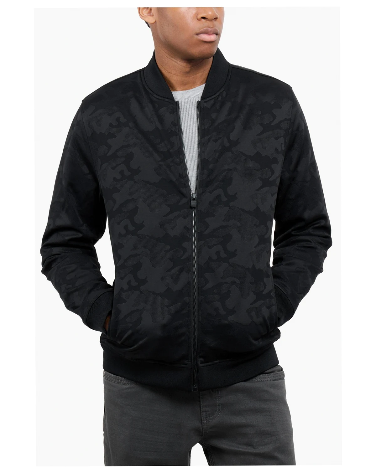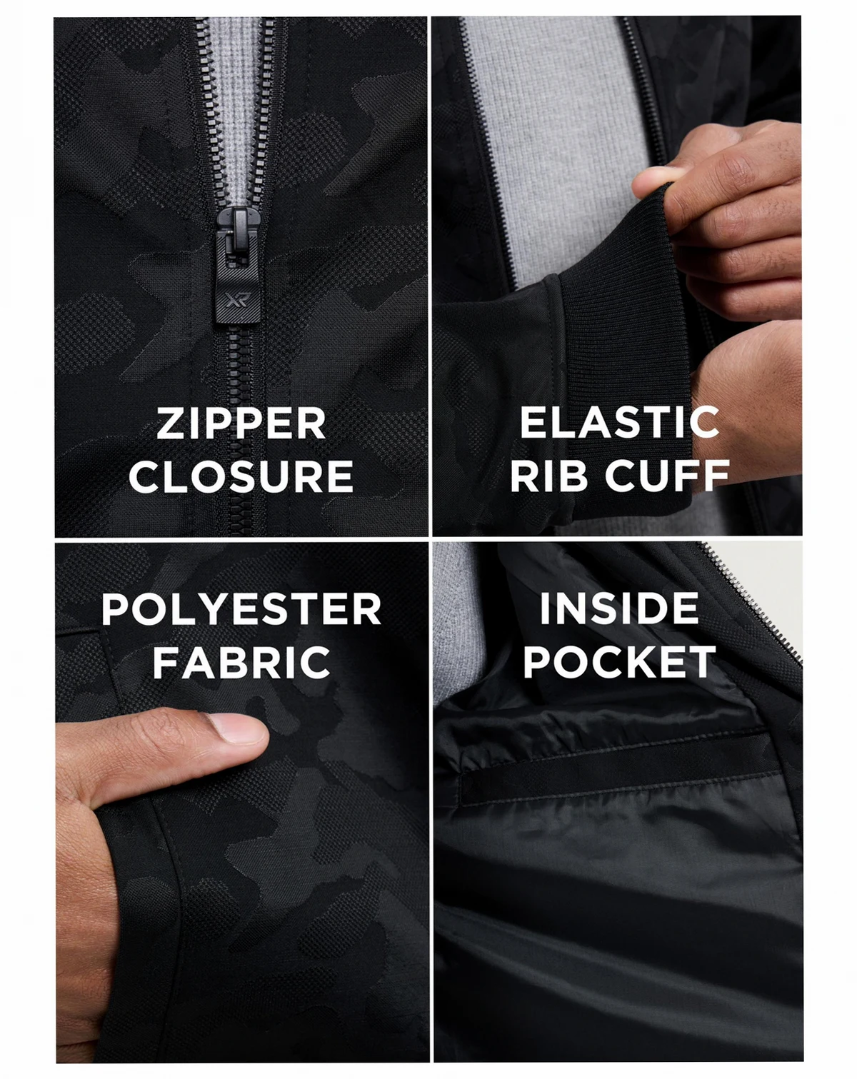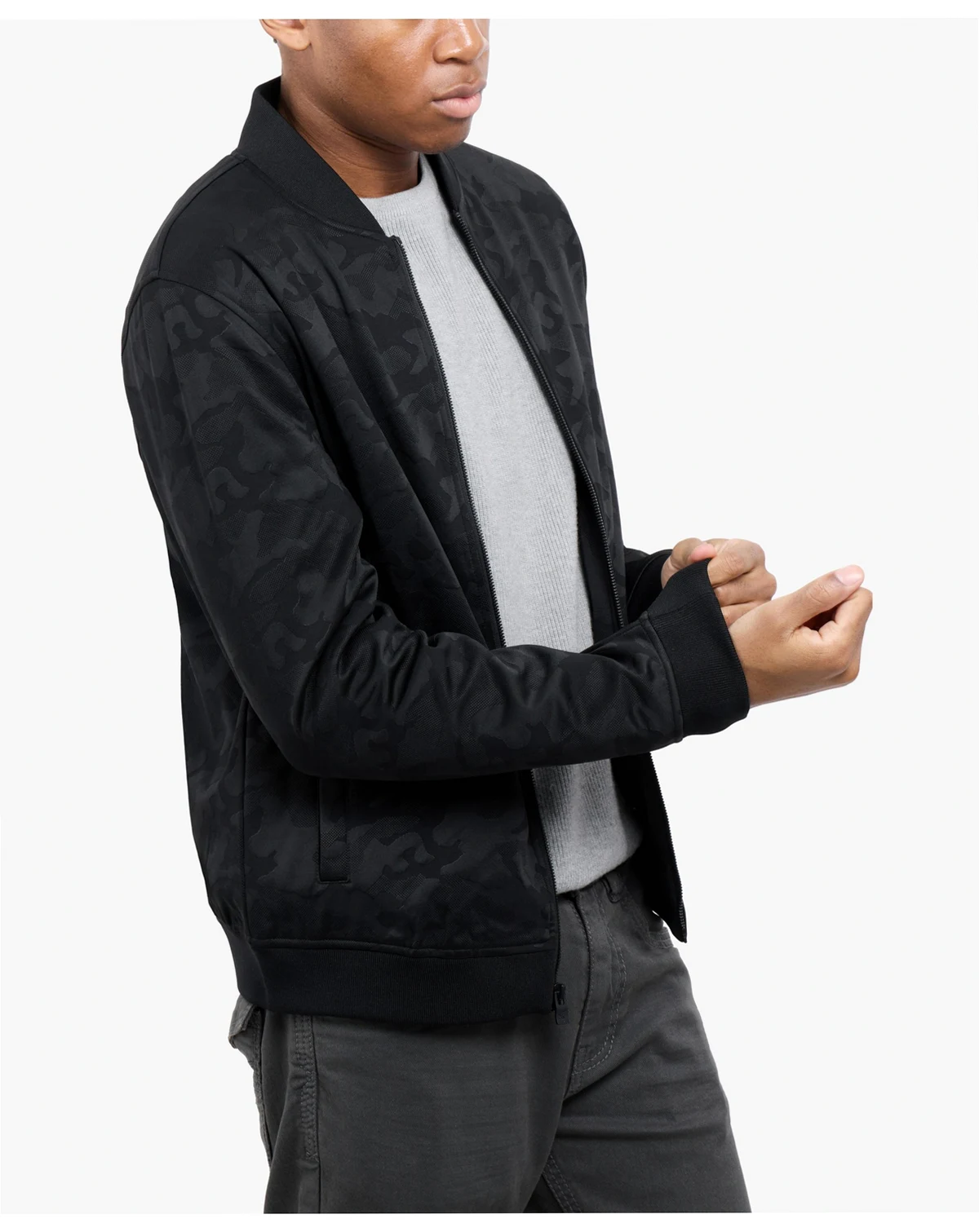Tonal camo jacquard fabric. 100% polyester 320 gsm. Full zip front closure. Ribbed collar cuffs and hem. Two side welt pockets. Comfortable regular fit. Versatile midweight design.