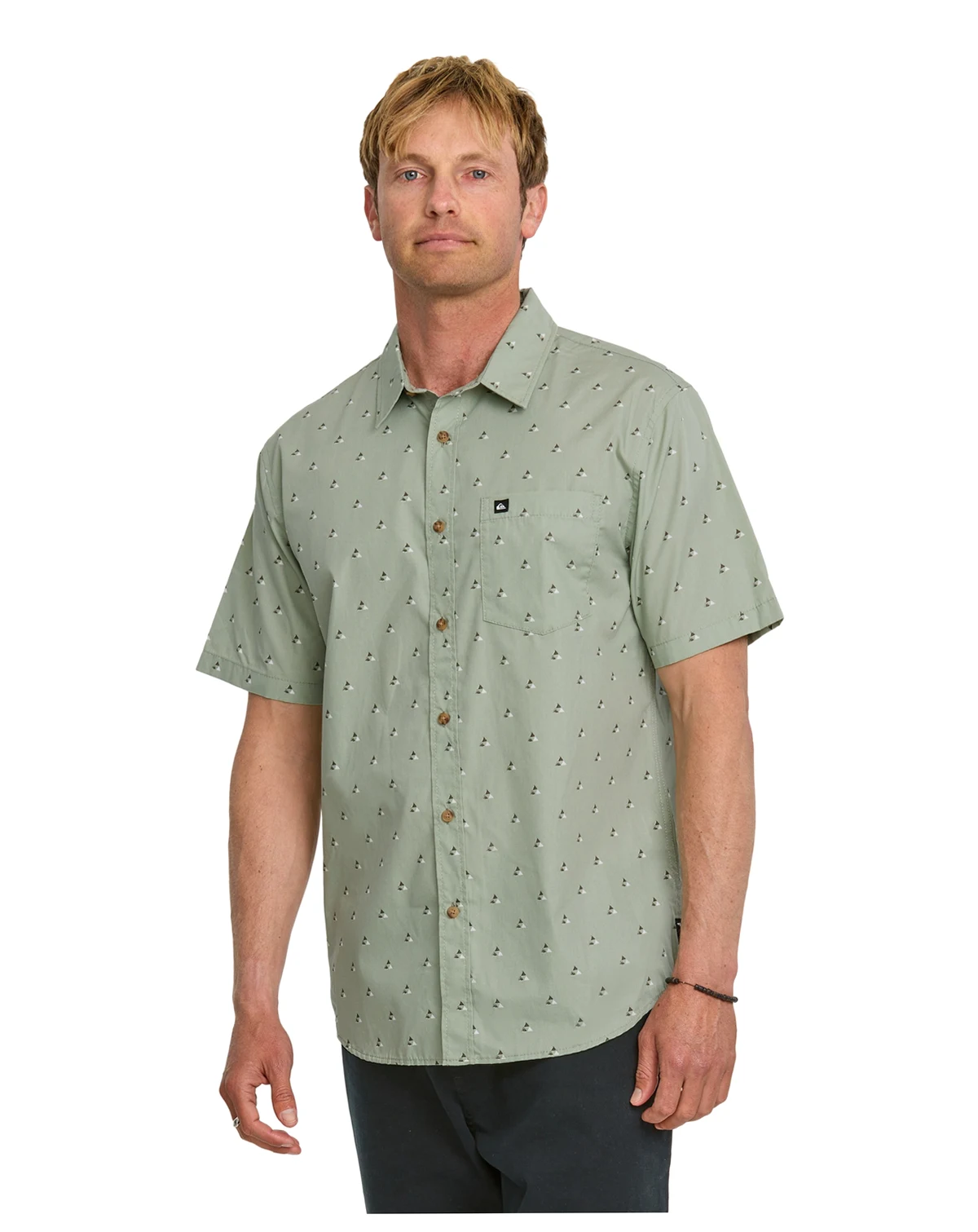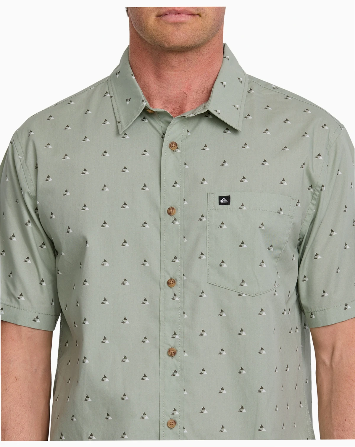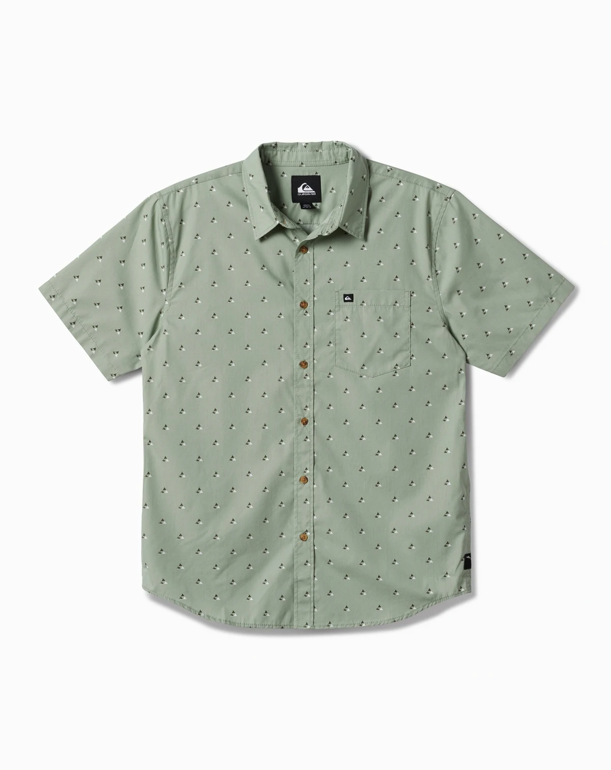 Experience comfort and style with Quiksilver's Short-Sleeve Woven Shirt, featuring a regular fit, classic collar neck, short sleeves, button closure, single chest pocket, and scalloped hem.