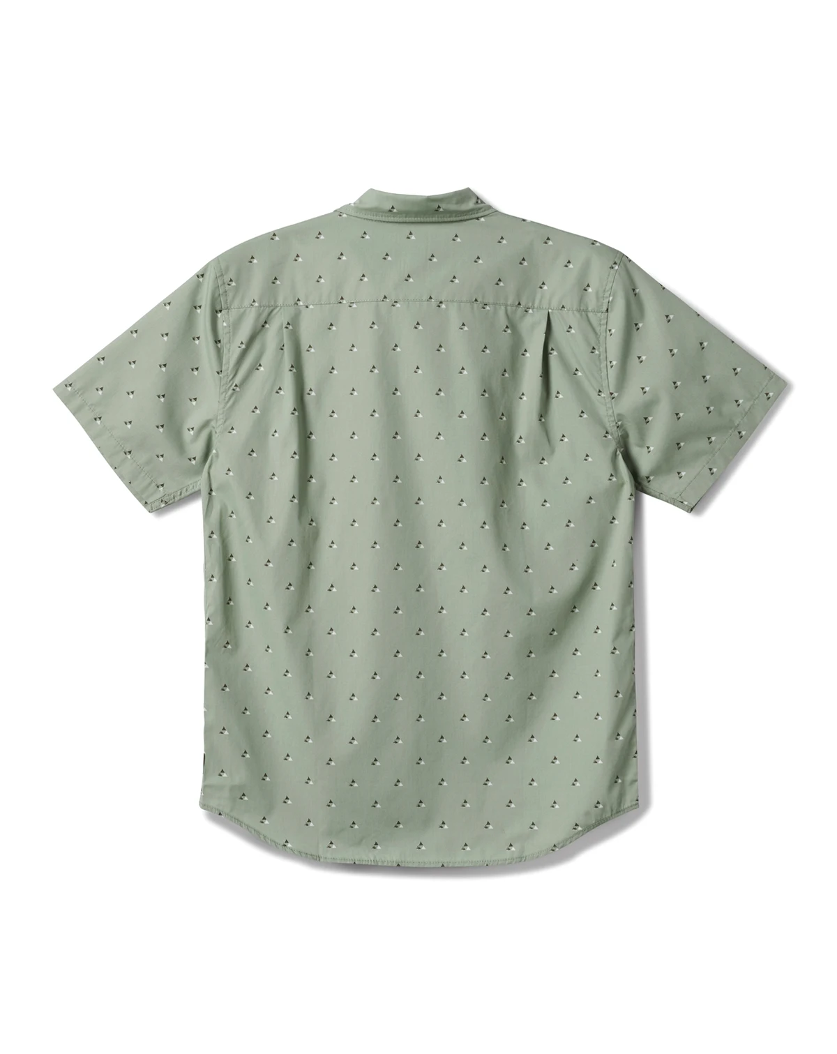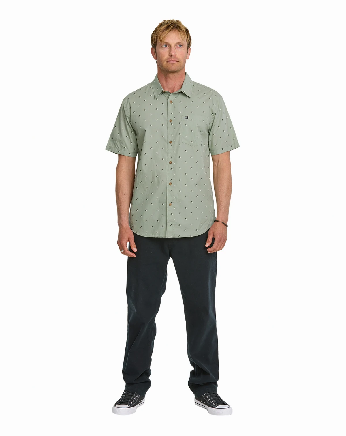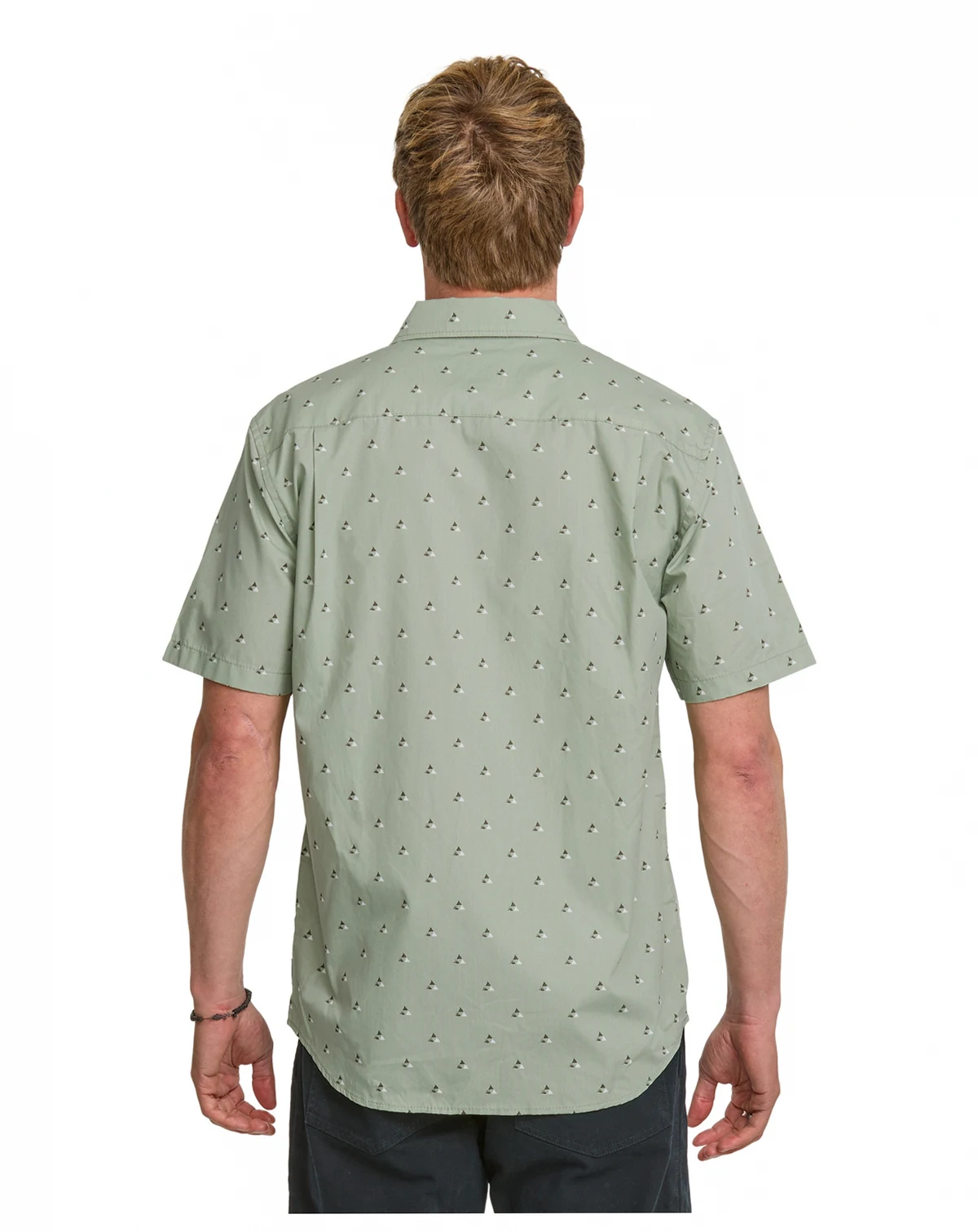 Experience comfort and style with Quiksilver's Short-Sleeve Woven Shirt, featuring a regular fit, classic collar neck, short sleeves, button closure, single chest pocket, and scalloped hem.