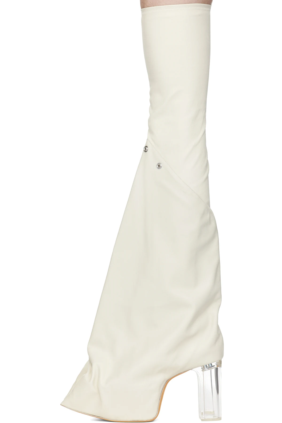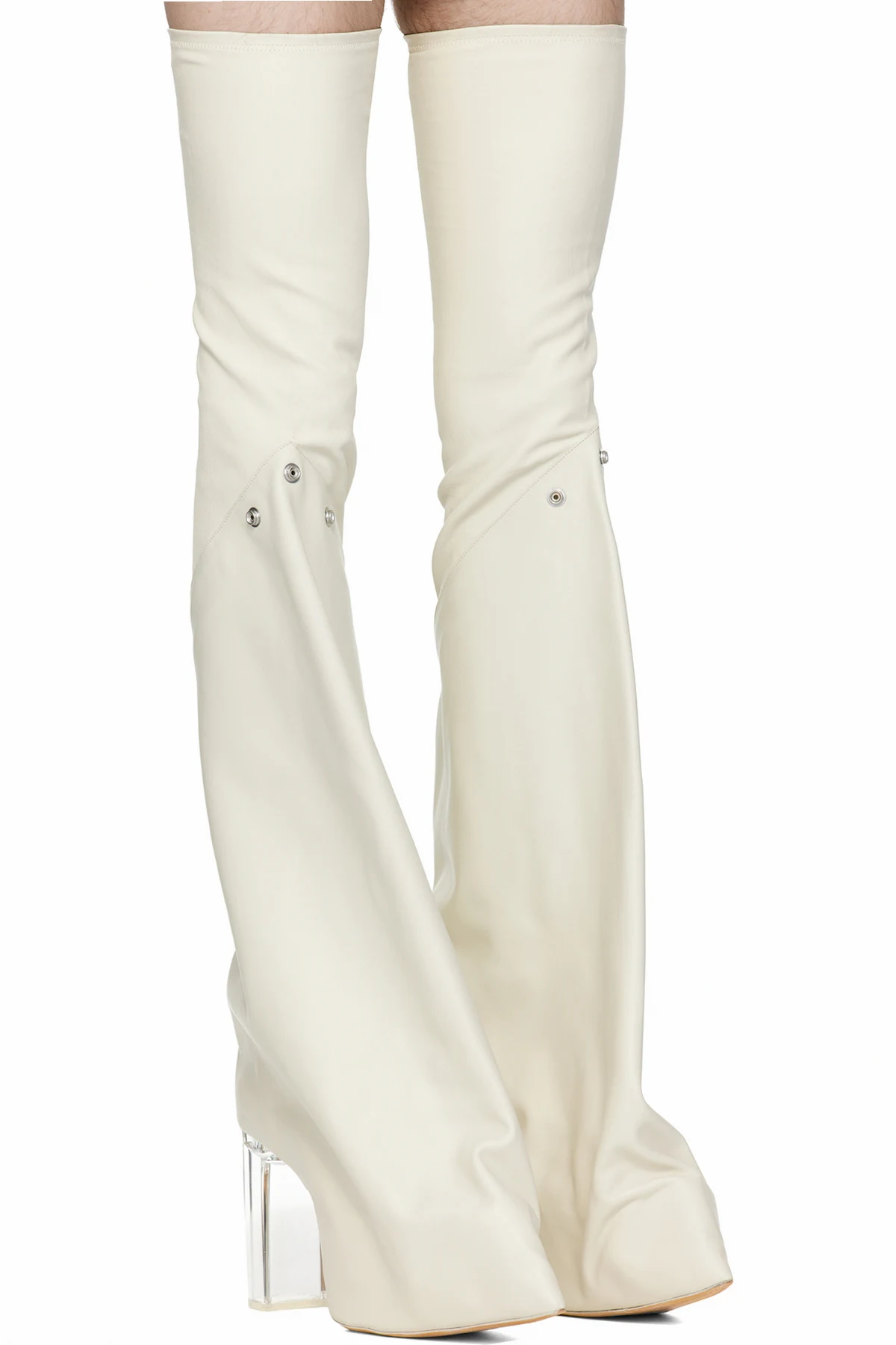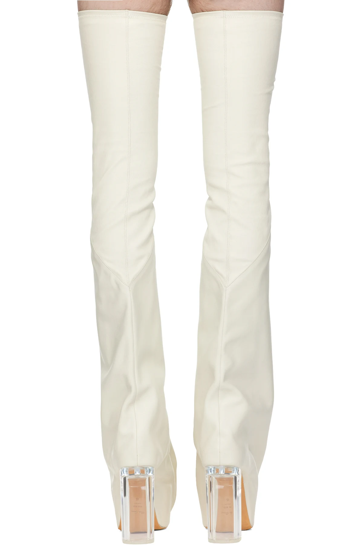 Thigh-high stretch buffed lambskin and grained calfskin boots.