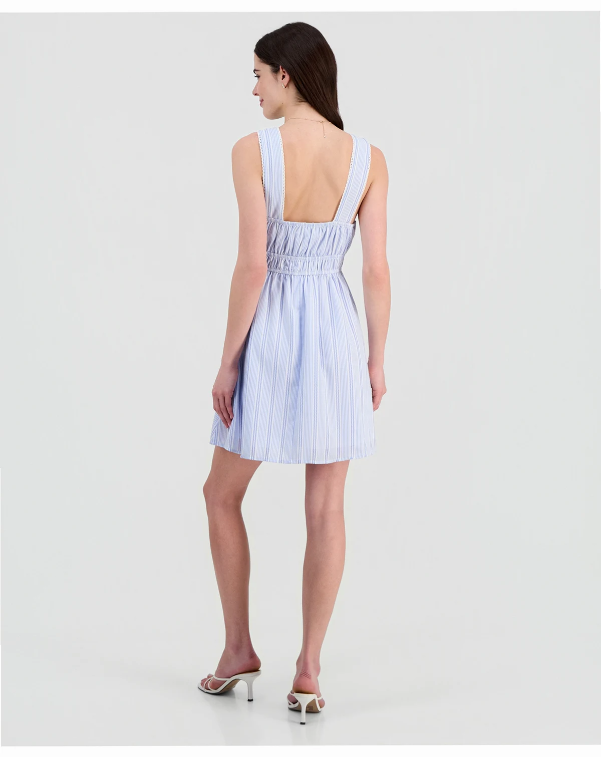 You'll love wearing a flirty, fun mini dress Sincerely Jules that's styled with shirring, bows and delicate picot trim.