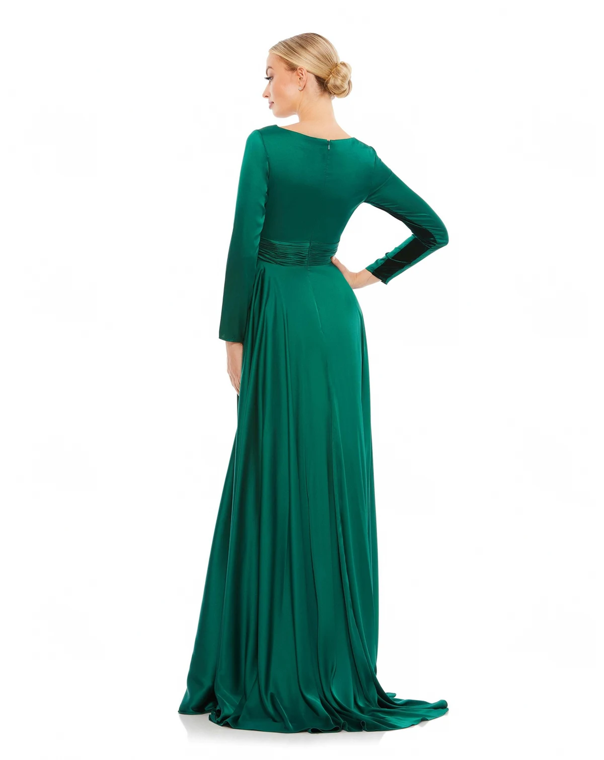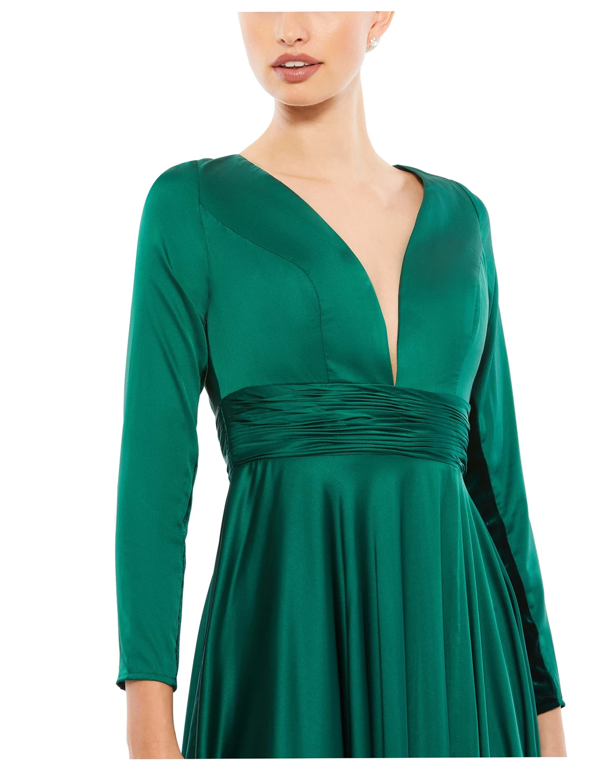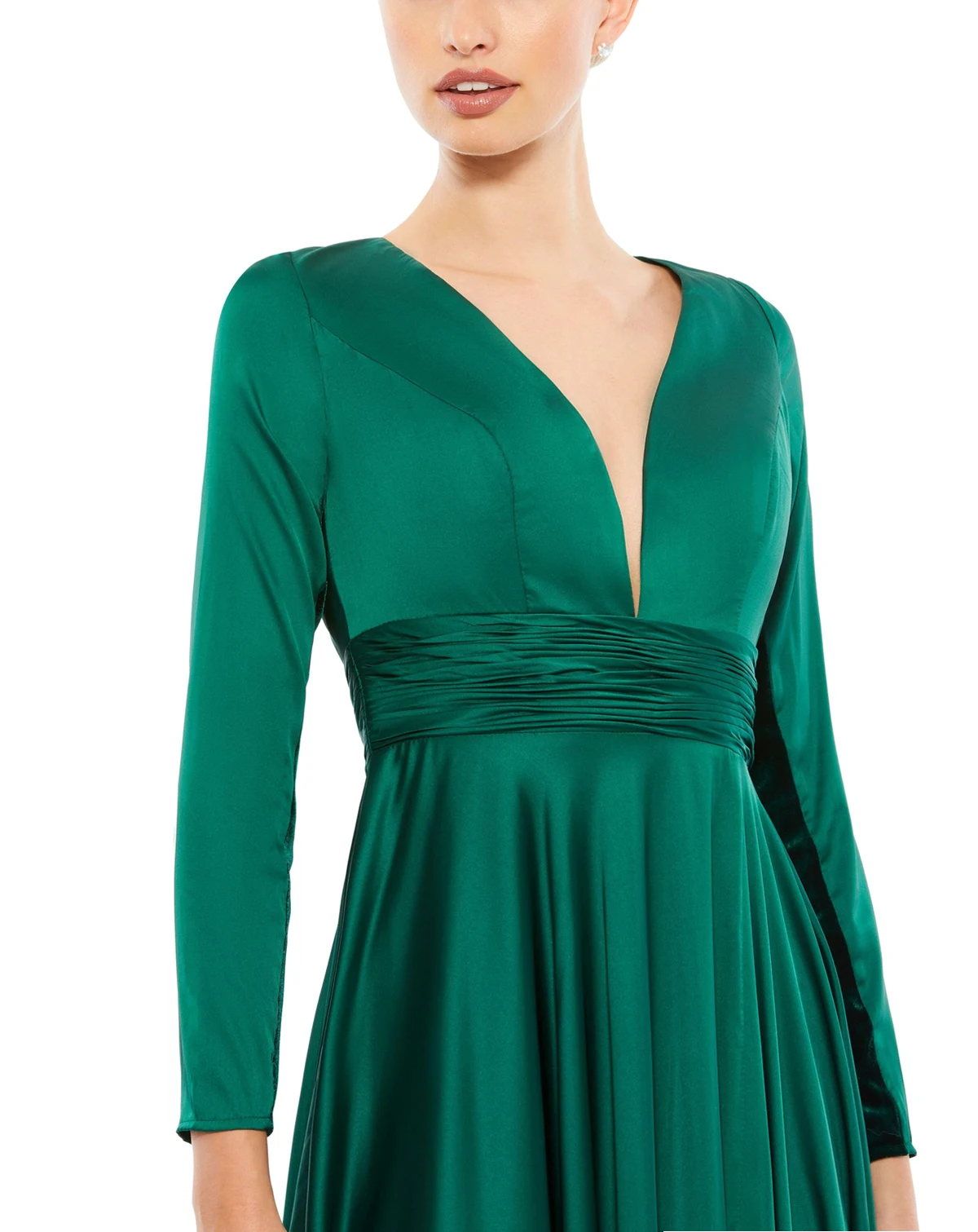 Make an unforgettable entrance in this elegant evening gown. Designed with a deep V-neckline, long sleeves, and a ruched waistband, it flatters the silhouette while offering timeless sophistication. The flowing A-line skirt moves beautifully with every step, while the thigh-high slit adds a touch of drama and allure. Perfect for galas, weddings, and formal events, this full-length gown blends glamour and comfort, ensuring you feel confident and stylish for any special occasion.