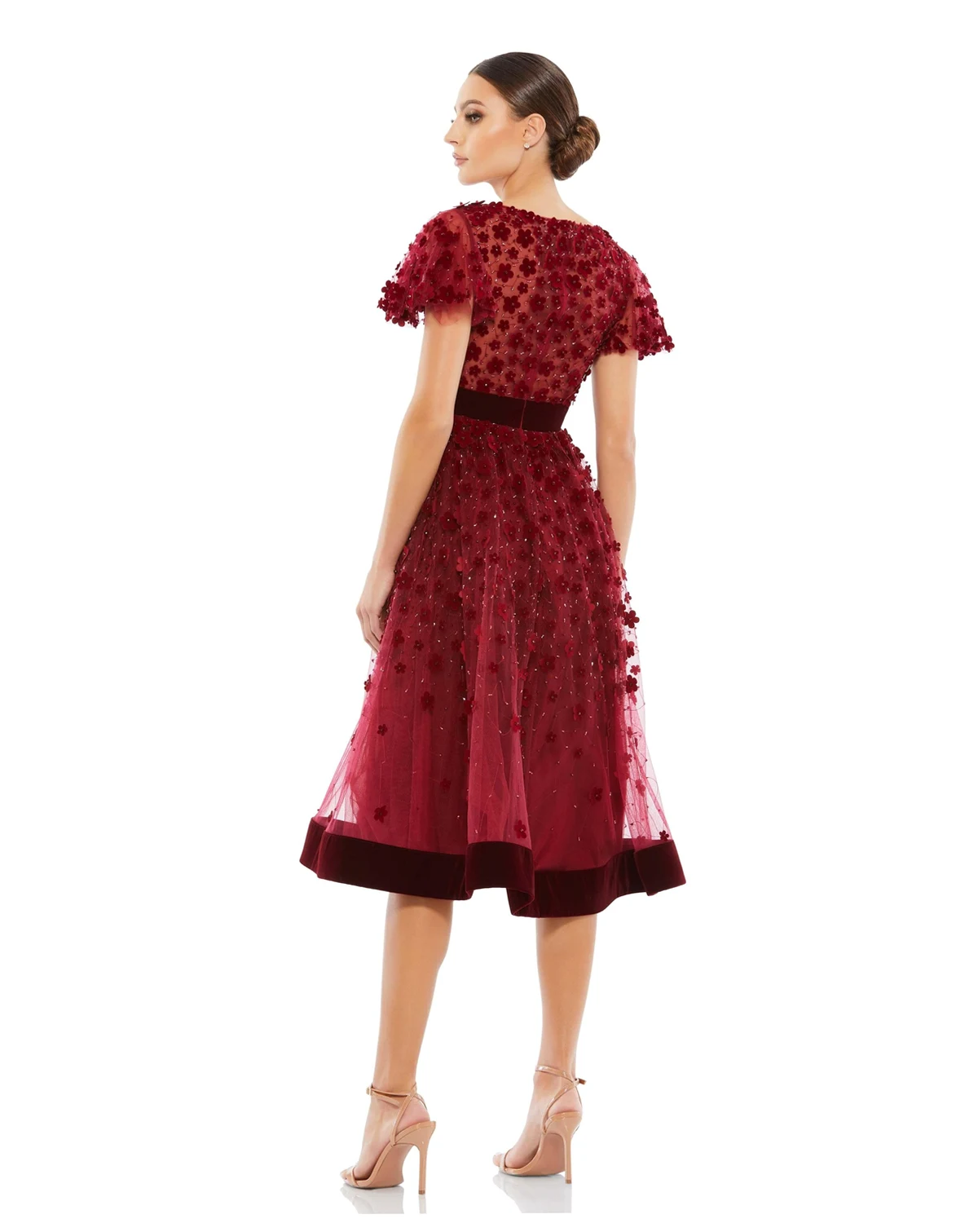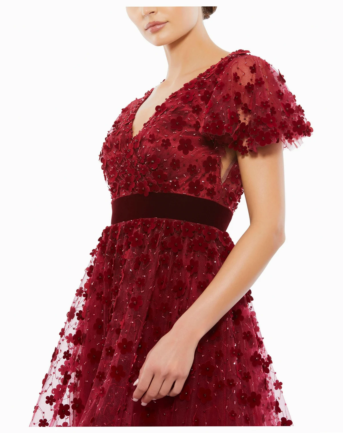 Tea-length V-neck dress with short flutter sleeves, velvet waistband, and 3D floral appliques adorned with delicate beading. Perfect for weddings, cocktail parties, and special occasions.