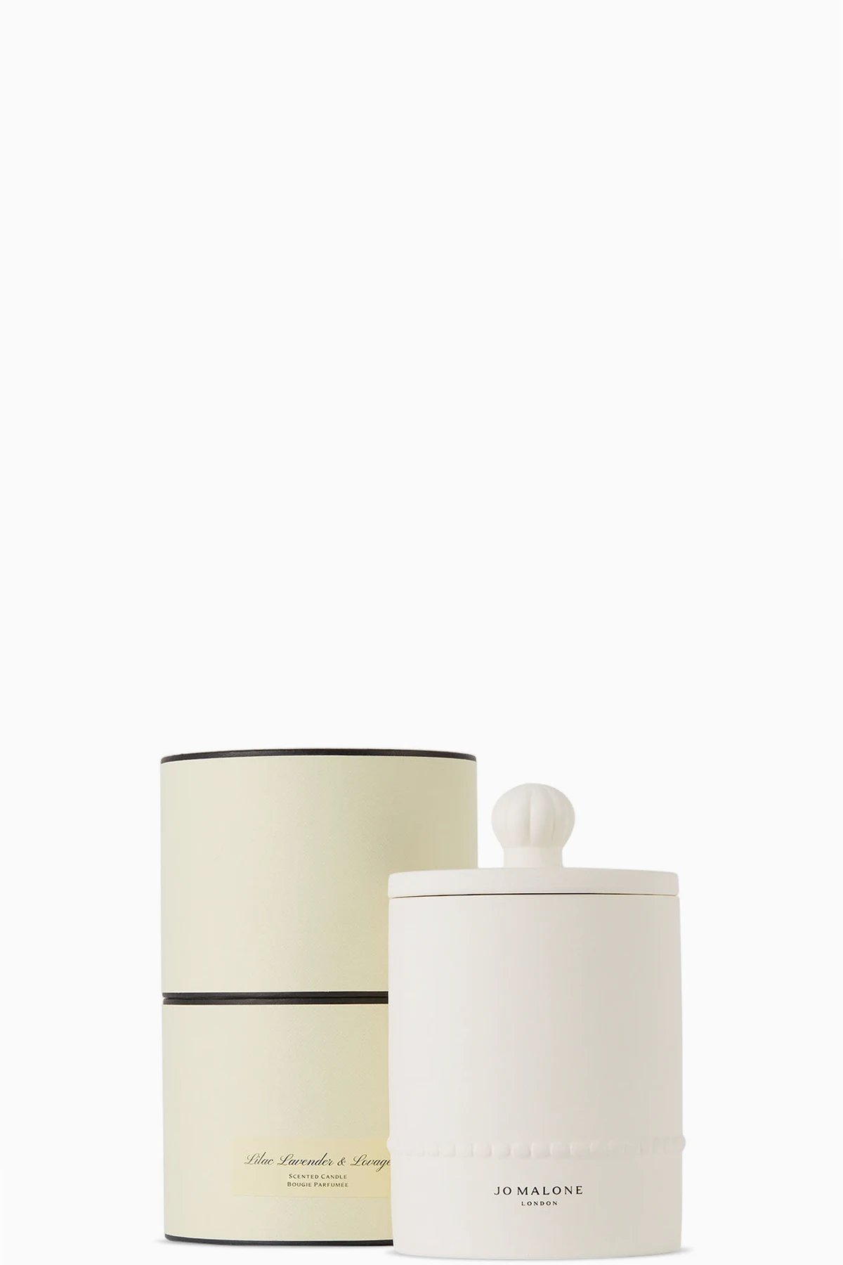 Handcrafted scented wax candle. Features fragrances feature lavender and lovage. Textured bisque ceramic vessel in white. Lid included.