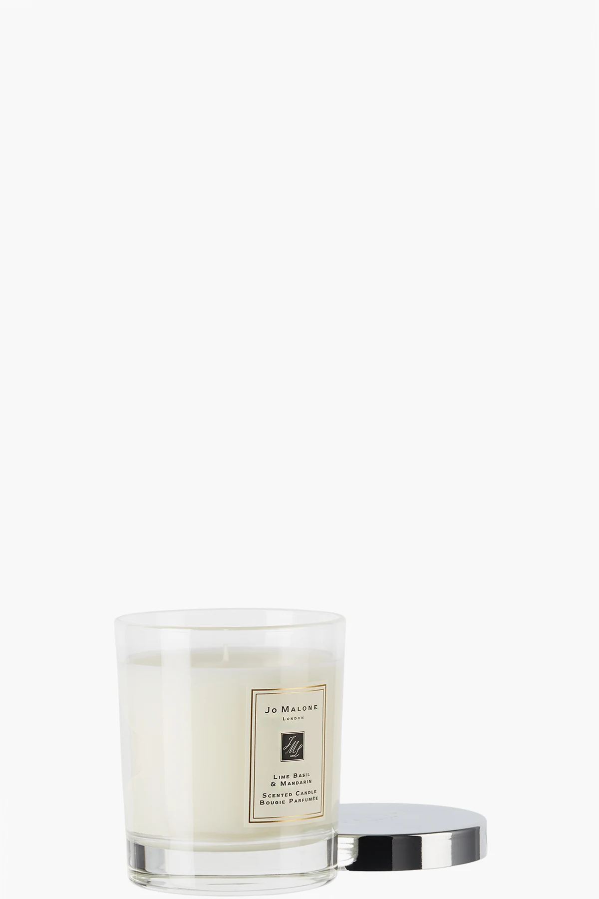 Handcrafted scented wax candle. Features fragrances of peppery basil, white thyme, and limes. Glass vessel. Lid included.