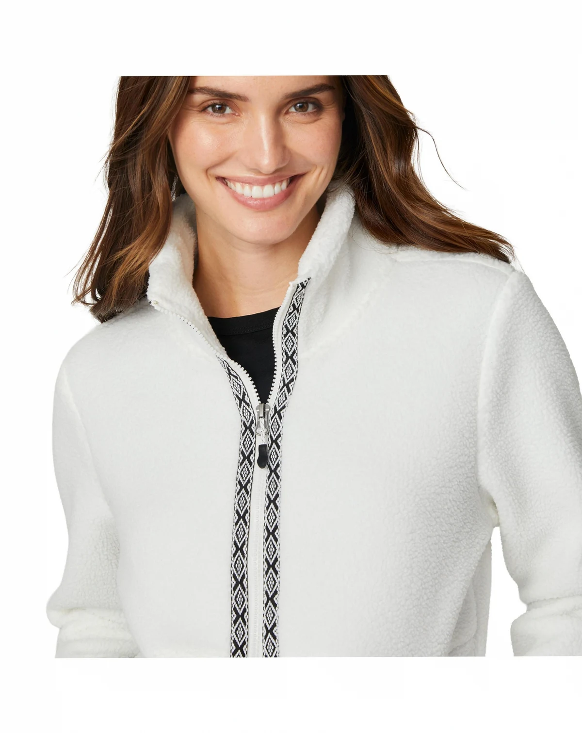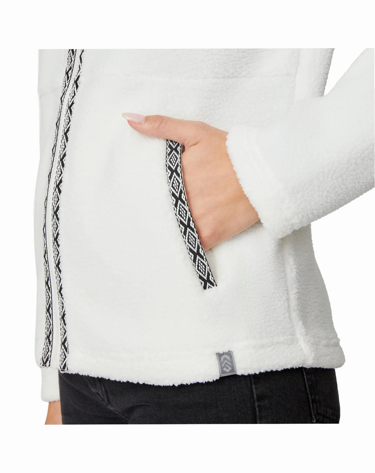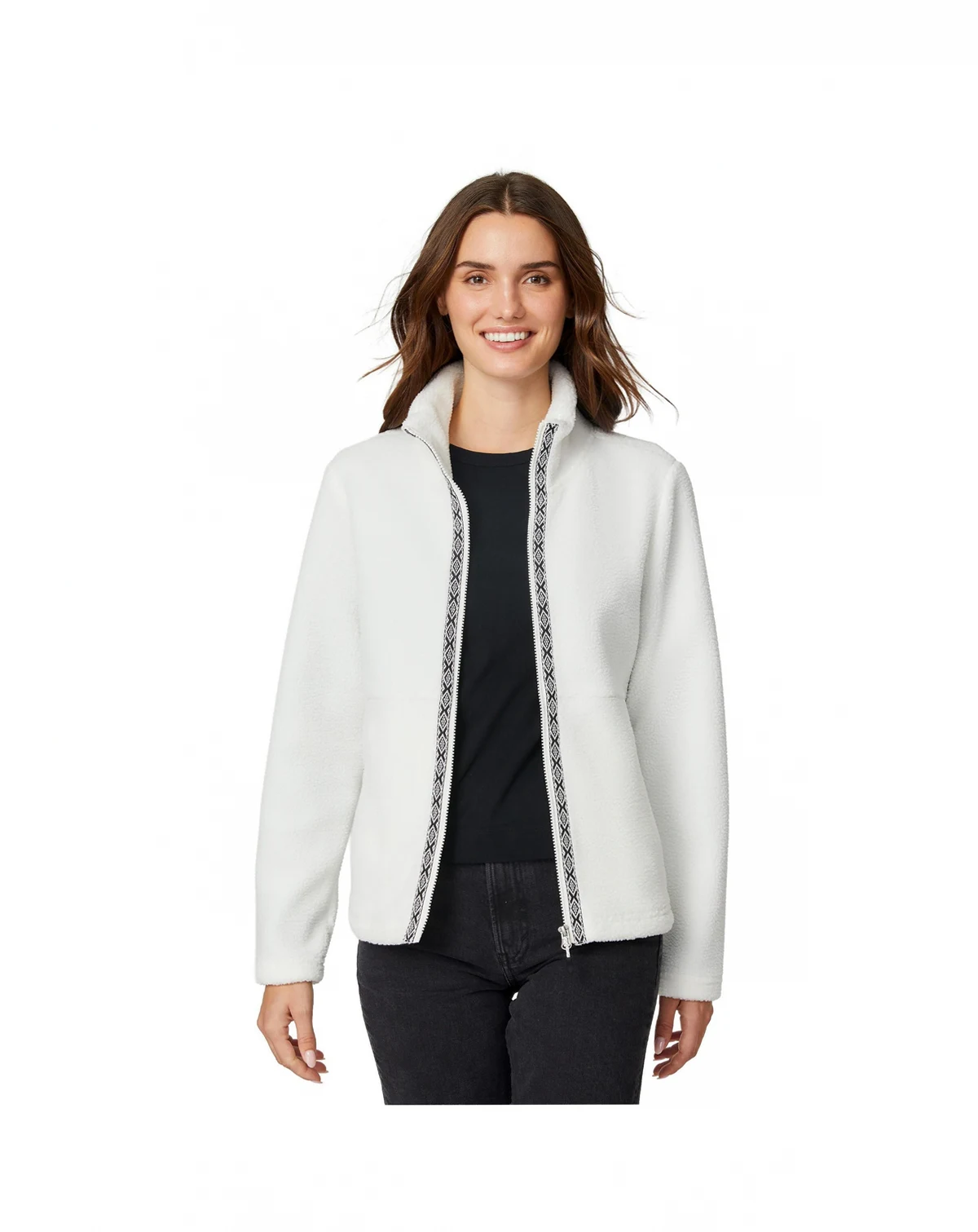 Stay warm, stylish, and adventure-ready in the Women s Flex Sherpa Jacket—crafted for comfort, warmth, and everyday versatility. Made from 100% polyester, it features plush high-pile fleece that traps heat while staying breathable, ideal for layering on chilly hikes, campfire nights, or weekend getaways. A high collar offers added wind protection, and the patterned tape detail adds a modern, outdoorsy touch to your cold-weather look.