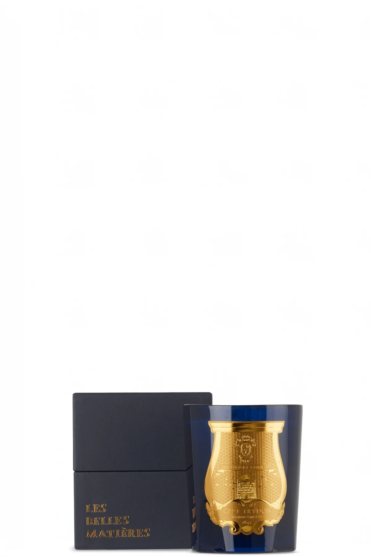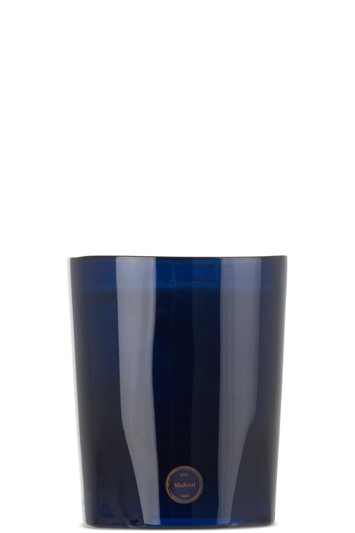 Hand-poured wax candle in Madurai. Fragrances feature jasmine and ylang ylang. Glass vessel in blue.