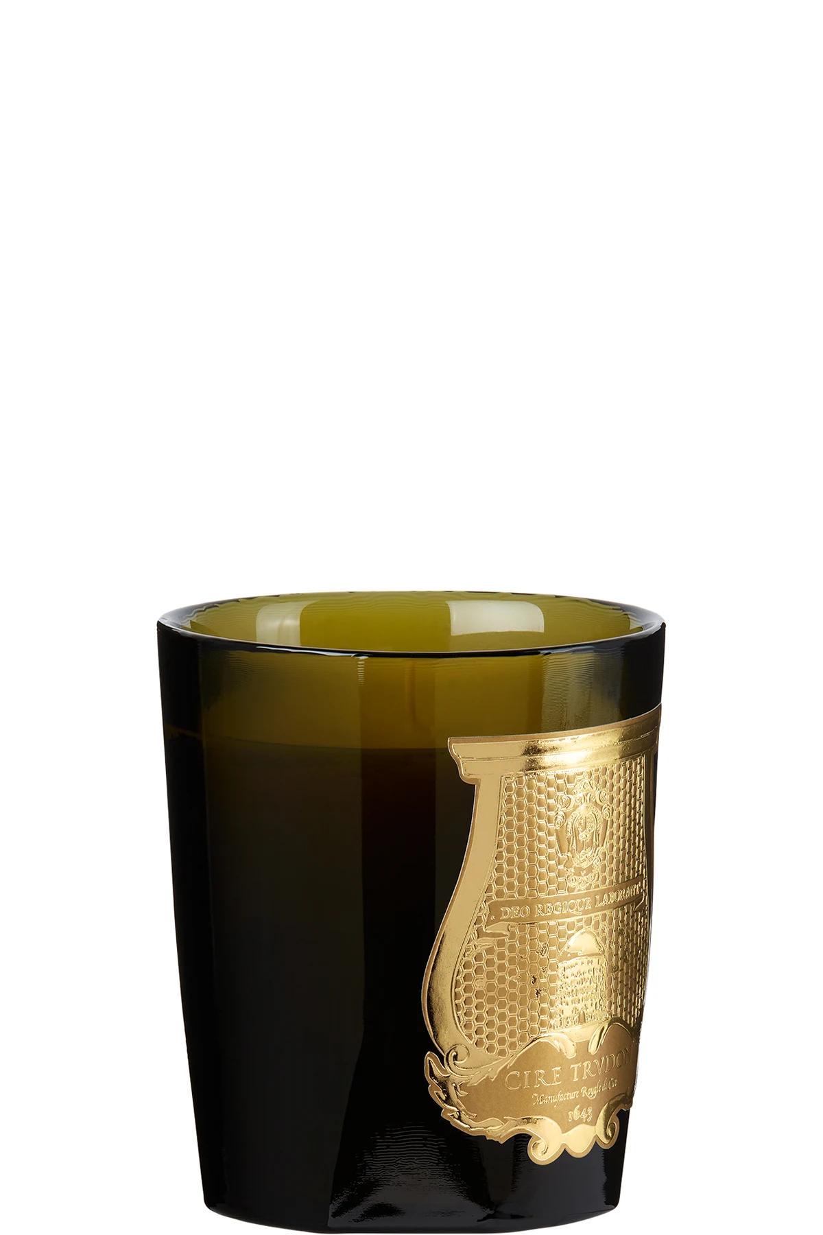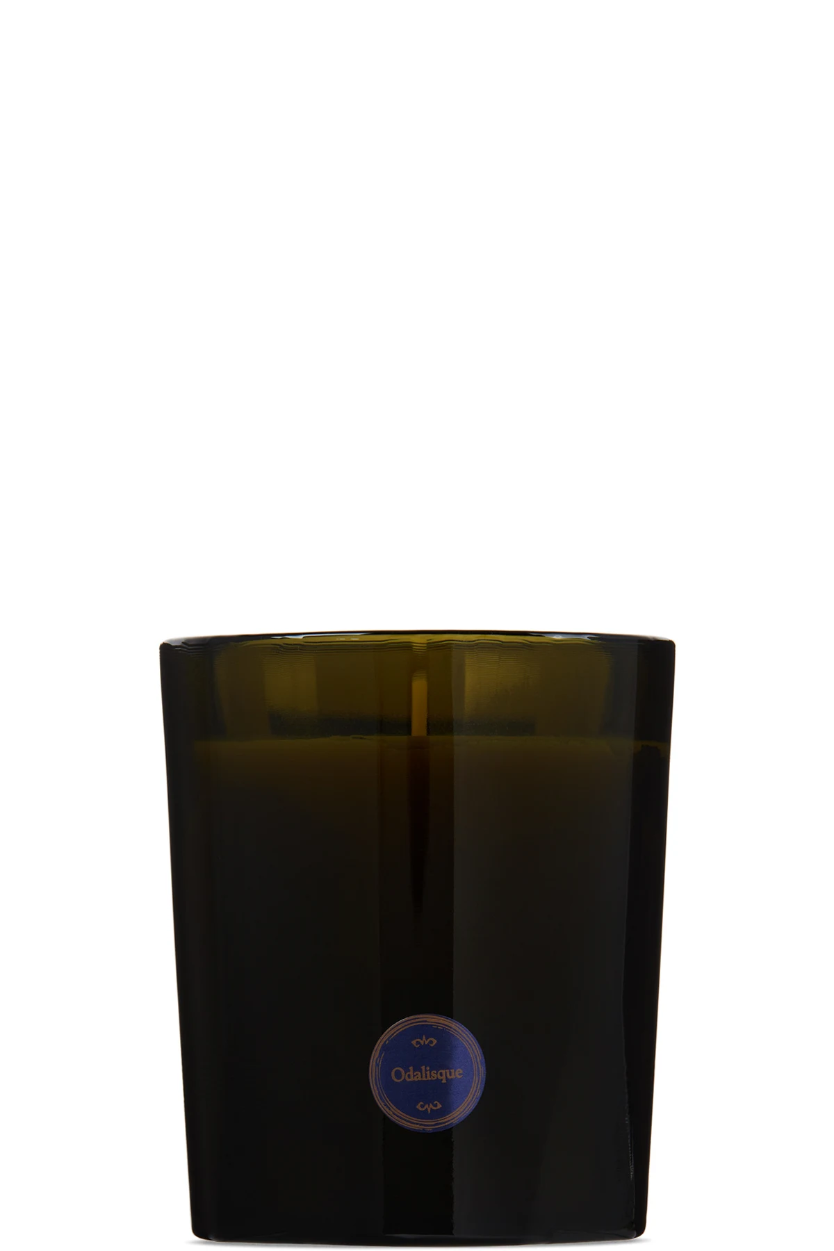 Hand-poured wax candle in Odalisque. Fragrances feature orange, lemon, and vanilla. Glass vessel in green.