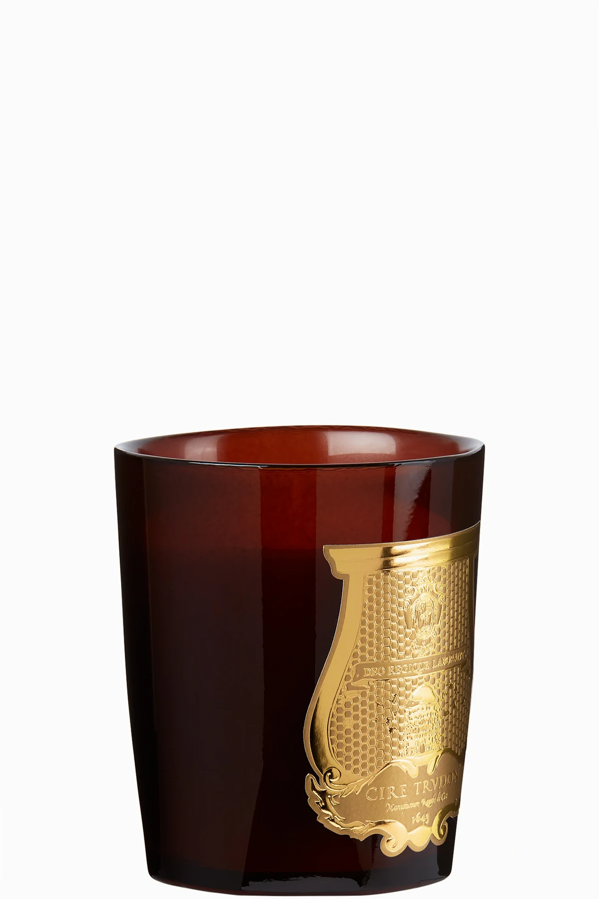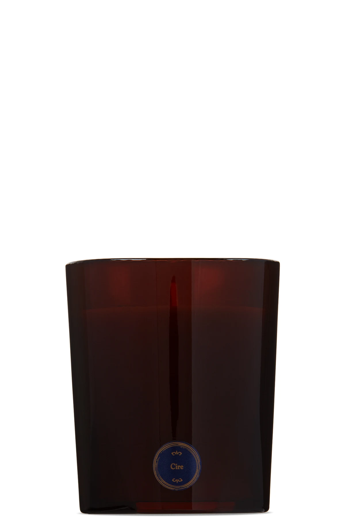 Hand-poured wax candle in Cire. Fragrances feature bergamot, honey, and cinnamon. Glass vessel in brown.