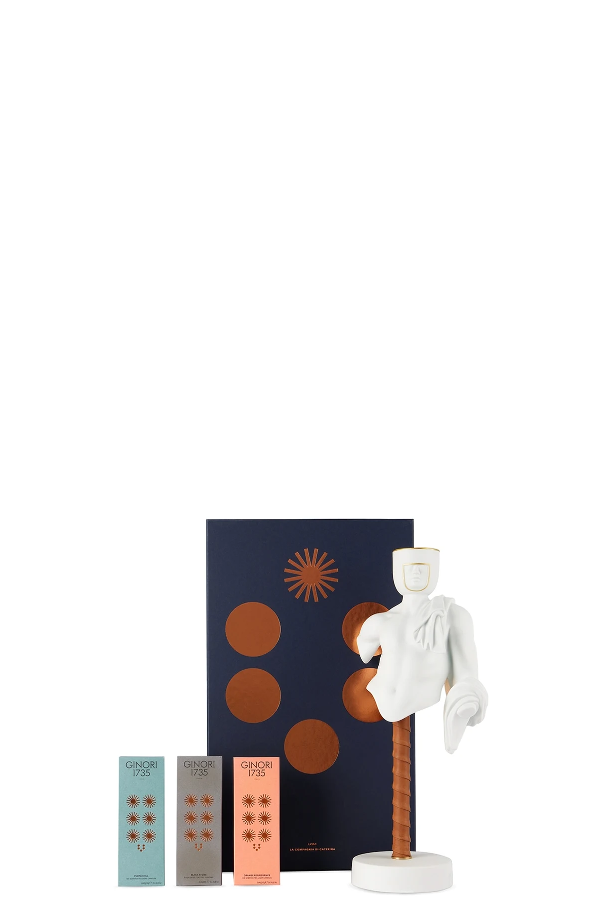 Sculptural bisque porcelain candle holder in white. Includes three sets of scented tea light candles.