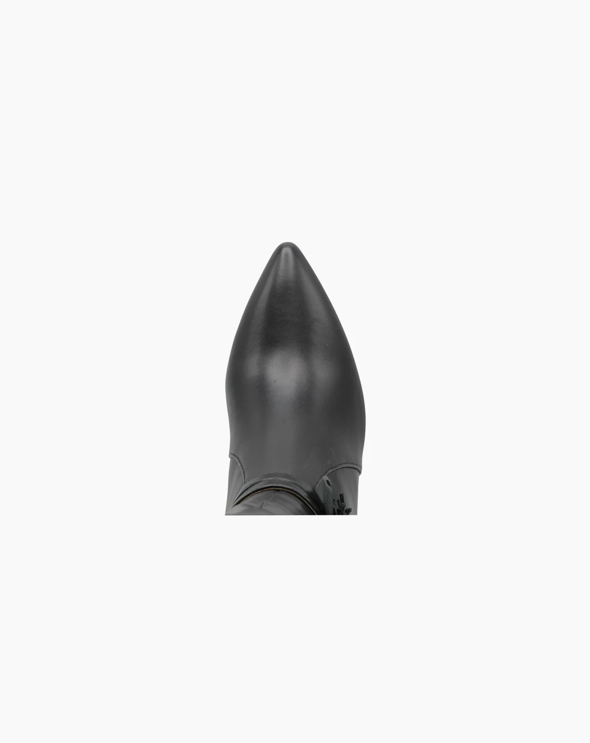 A classic boot on a stilleto heel and side zip entry, with an added floral circlet around the ankle