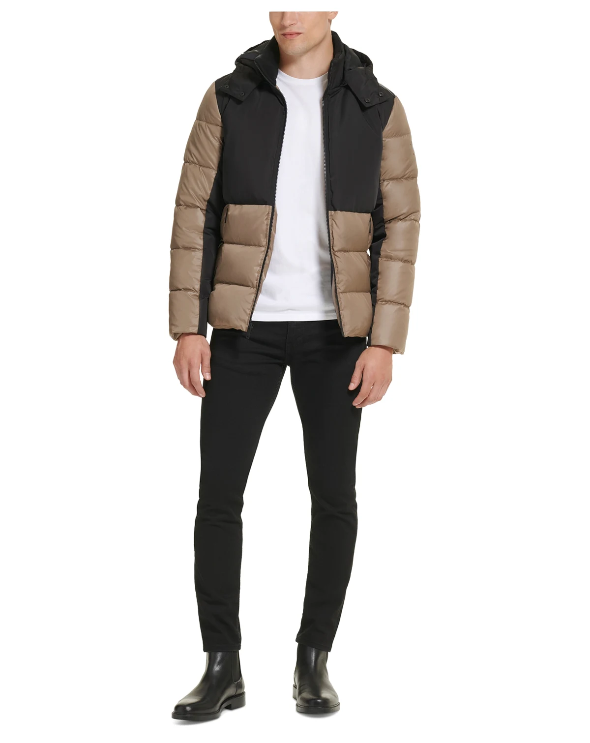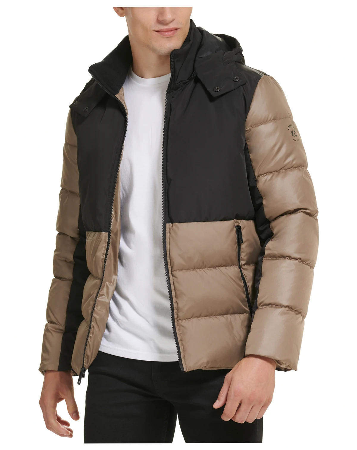 A combination mixed-media and colorblocked design make this Kenneth Cole puffer jacket a stylishly modern piece while its heavyweight design delivers on warmth and comfort.